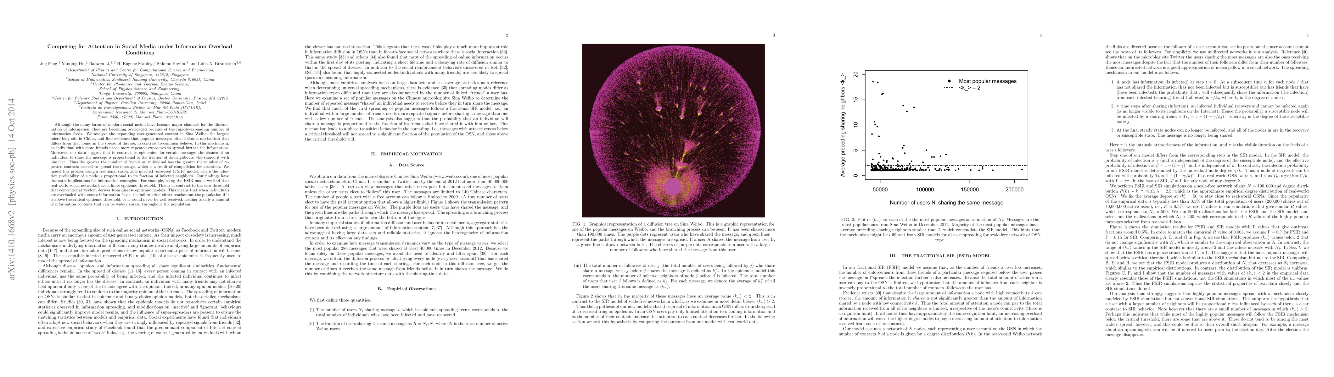 Although the many forms of modern social media have become major channels for the dissemination of information, they are becoming overloaded because of the rapidly-expanding number of information feeds. We analyze the expanding user-generated content in Sina Weibo, the largest micro-blog site in China, and find evidence that popular messages often follow a mechanism that differs from that found in the spread of disease, in contrast to common believe. In this mechanism, an individual with more friends needs more repeated exposures to spread further the information. Moreover, our data suggest that in contrast to epidemics, for certain messages the chance of an individual to share the message is proportional to the fraction of its neighbours who shared it with him/her. Thus the greater the number of friends an individual has the greater the number of repeated contacts needed to spread the message, which is a result of competition for attention. We model this process using a fractional susceptible infected recovered (FSIR) model, where the infection probability of a node is proportional to its fraction of infected neighbors. Our findings have dramatic implications for information contagion. For example, using the FSIR model we find that real-world social networks have a finite epidemic threshold. This is in contrast to the zero threshold that conventional wisdom derives from disease epidemic models. This means that when individuals are overloaded with excess information feeds, the information either reaches out the population if it is above the critical epidemic threshold, or it would never be well received, leading to only a handful of information contents that can be widely spread throughout the population.
