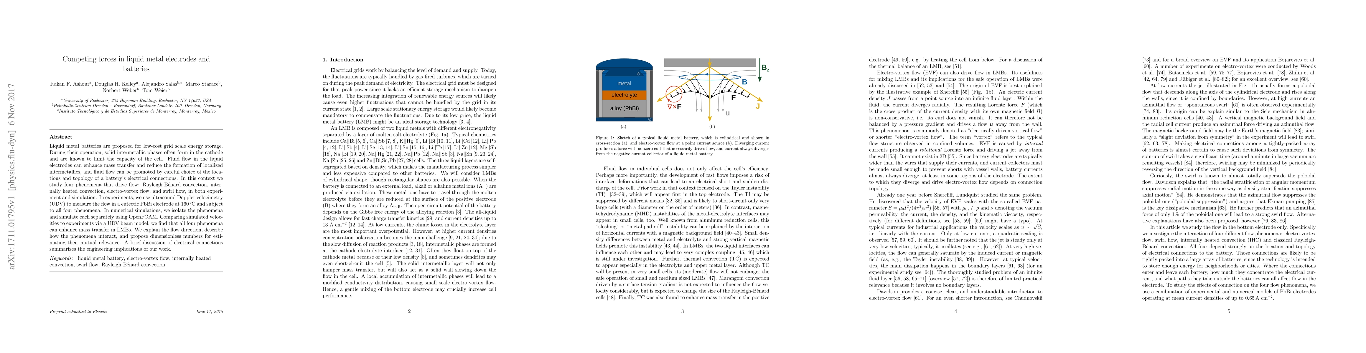 This paper investigates four phenomena—Rayleigh-Bénard convection, internally heated convection, electro-vortex flow, and swirl flow—that drive fluid flow in liquid metal batteries, enhancing mass transfer and reducing intermetallic phase formation. Experimental and simulation results show that these phenomena can significantly improve battery performance, with implications for the design of electrical connections.