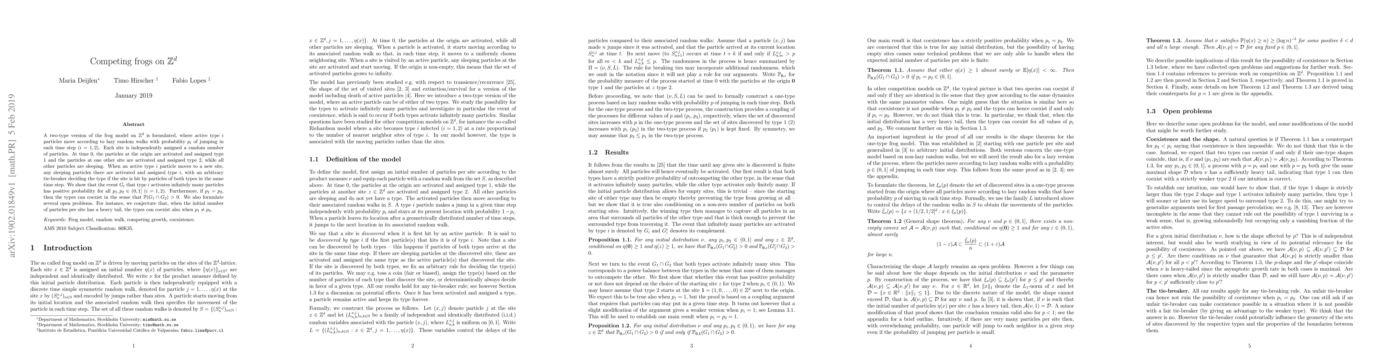 A two-type version of the frog model on $\mathbb{Z}^d$ is formulated, where active type $i$ particles move according to lazy random walks with probability $p_i$ of jumping in each time step ($i=1,2$). Each site is independently assigned a random number of particles. At time 0, the particles at the origin are activated and assigned type 1 and the particles at one other site are activated and assigned type 2, while all other particles are sleeping. When an active type $i$ particle moves to a new site, any sleeping particles there are activated and assigned type $i$, with an arbitrary tie-breaker deciding the type if the site is hit by particles of both types in the same time step. We show that the event $G_i$ that type $i$ activates infinitely many particles has positive probability for all $p_1,p_2\in(0,1]$ ($i=1,2$). Furthermore, if $p_1=p_2$, then the types can coexist in the sense that $\mathbb{P}(G_1\cap G_2)>0$. We also formulate several open problems. For instance, we conjecture that, when the initial number of particles per site has a heavy tail, the types can coexist also when $p_1\neq p_2$.