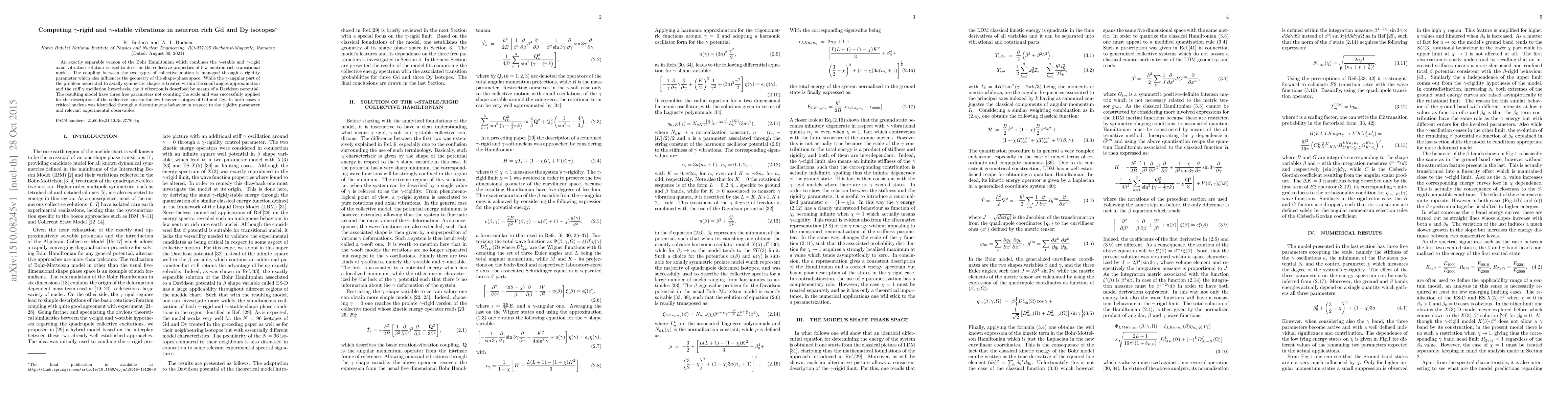 An exactly separable version of the Bohr Hamiltonian which combines the $\gamma$-stable and $\gamma$-rigid axial vibration-rotation is used to describe the collective properties of few neutron rich transitional nuclei. The coupling between the two types of collective motion is managed through a rigidity parameter which also influences the geometry of the shape-phase space. While the $\gamma$-angular part of the problem associated to axially symmetric shapes is treated within the small angles approximation and the stiff $\gamma$ oscillation hypothesis, the $\beta$ vibration is described by means of a Davidson potential. The resulting model have three free parameters not counting the scale and was successfully applied for the description of the collective spectra for few heavier isotopes of Gd and Dy. In both cases a critical nucleus was identified through a discontinuous behavior in respect to the rigidity parameter and relevant experimental observables.