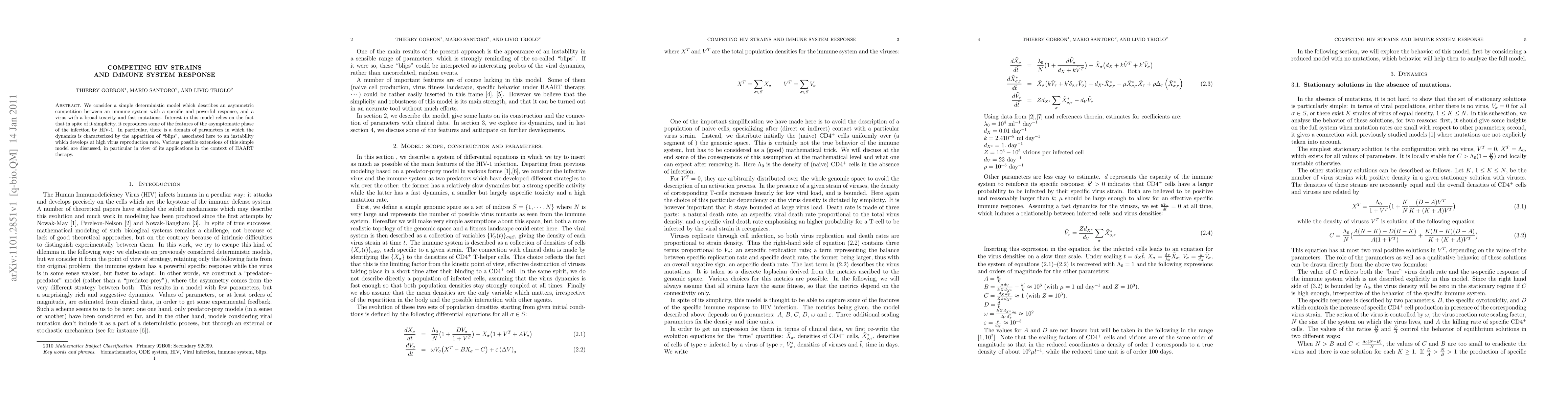 We consider a simple deterministic model which describes an asymmetric competition between an immune system with a specific and powerful response, and a virus with a broad toxicity and fast mutations. Interest in this model relies on the fact that in spite of it simplicity, it reproduces some of the features of the asymptomatic phase of the infection by HIV-1. In particular, there is a domain of parameters in which the dynamics is characterized by the apparition of \blips", associated here to an instability which develops at high virus reproduction rate. Various possible extensions of this simple model are discussed, in particular in view of its applications in the context of HAART therapy.