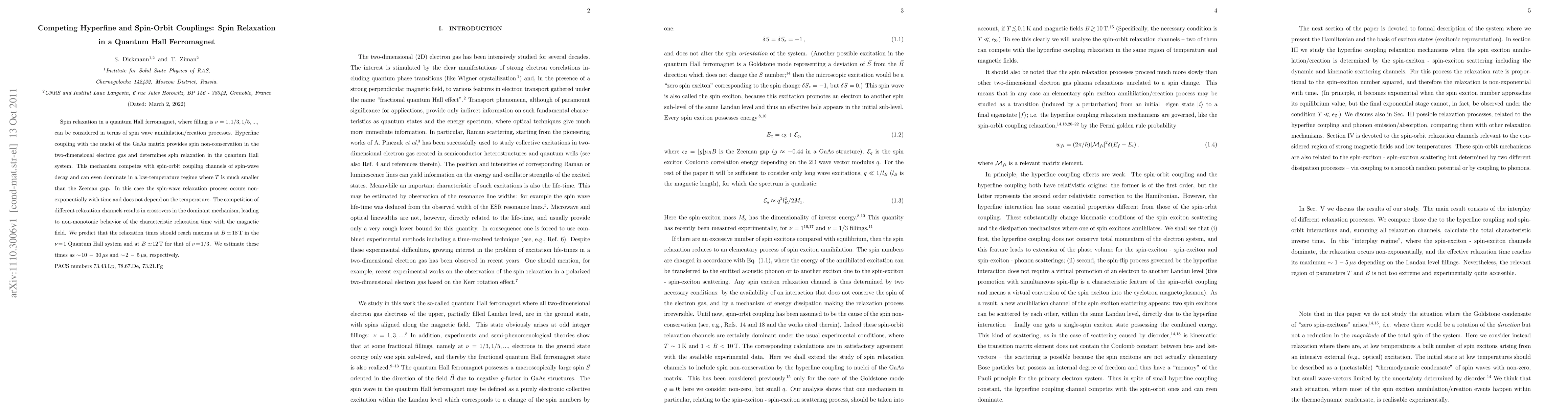 This paper investigates spin relaxation in quantum Hall ferromagnets, highlighting the competition between hyperfine coupling and spin-orbit coupling mechanisms. It predicts non-monotonic behavior in relaxation times with magnetic field, reaching maxima at specific field strengths.