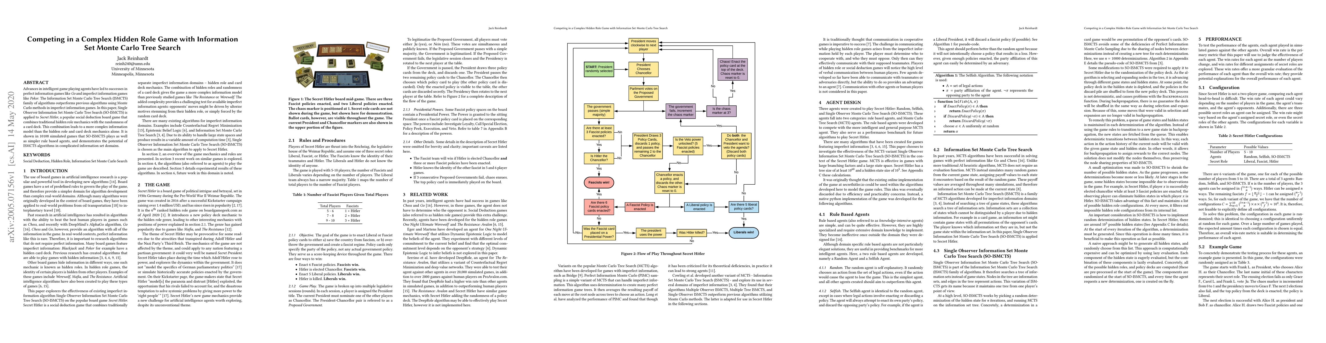 This paper explores the application of Single Observer Information Set Monte Carlo Tree Search (SO-ISMCTS) to Secret Hitler, a complex hidden role game. The study demonstrates that SO-ISMCTS performs comparably to simpler rule-based agents in 10,108 simulations, highlighting the potential of ISMCTS algorithms in intricate information set environments.