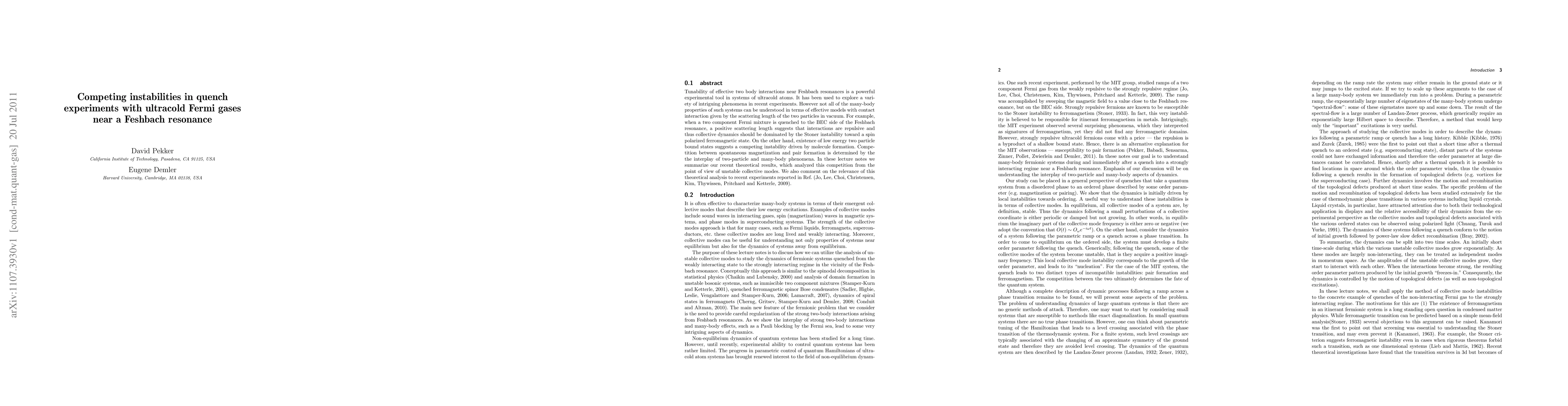 Tunability of effective two body interactions near Feshbach resonances is a powerful experimental tool in systems of ultracold atoms. It has been used to explore a variety of intriguing phenomena in recent experiments. However not all of the many-body properties of such systems can be understood in terms of effective models with contact interaction given by the scattering length of the two particles in vacuum. For example, when a two component Fermi mixture is quenched to the BEC side of the Feshbach resonance, a positive scattering length suggests that interactions are repulsive and thus collective dynamics should be dominated by the Stoner instability toward a spin polarized ferromagnetic state. On the other hand, existence of low energy two particle bound states suggests a competing instability driven by molecule formation. Compe- tition between spontaneous magnetization and pair formation is determined by the the interplay of two-particle and many-body phenomena. In these lecture notes we summarize our recent theoretical results, which analyzed this competition from the point of view of unstable collective modes. We also comment on the relevance of this theoretical analysis to recent experiments reported in Ref. (Jo, Lee, Choi, Christensen, Kim, Thywissen, Pritchard and Ketterle, 2009).
