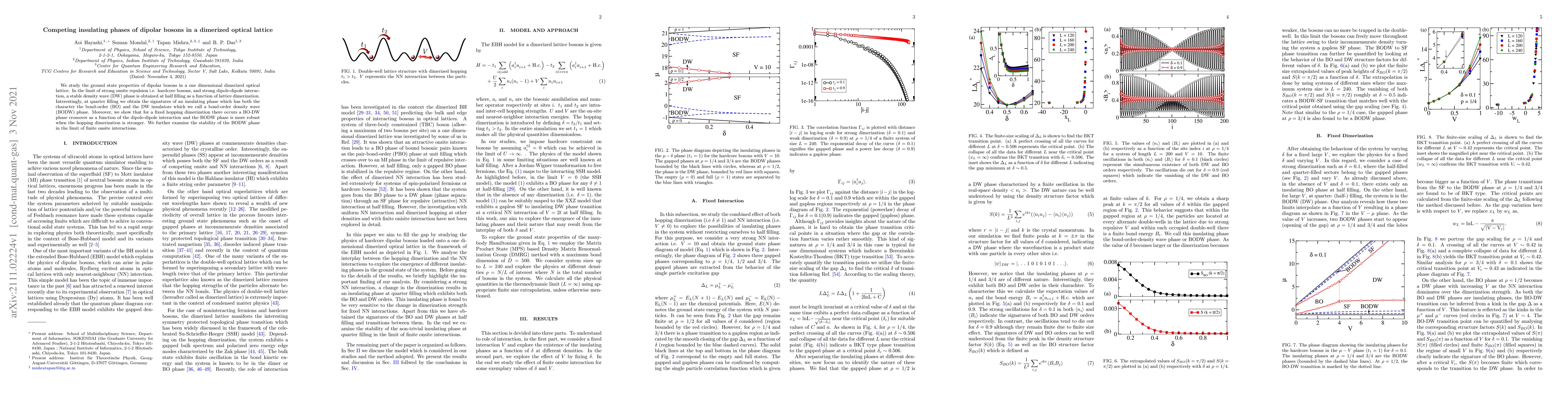 Researchers study dipolar bosons in a dimerized optical lattice, finding two insulating phases: a density wave phase at half filling and a bond-order density wave phase at quarter filling, with the latter being more robust under certain conditions.