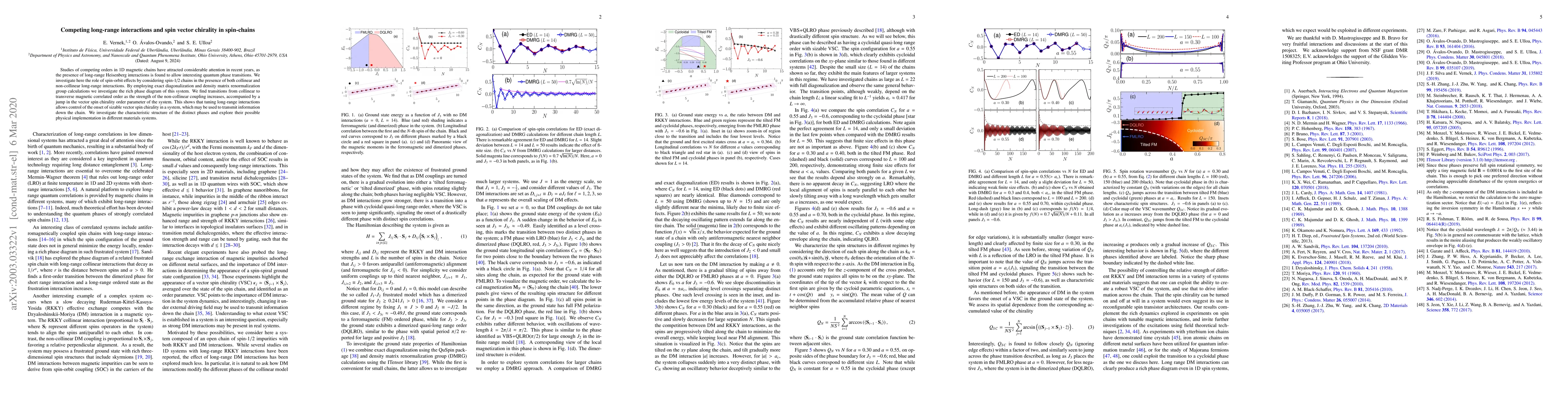 This research investigates spin-1/2 chains with competing long-range interactions, revealing quantum phase transitions and transitions from collinear to transverse magnetic order. Tuning non-collinear coupling induces vector spin chirality, suggesting potential applications for information transmission in magnetic systems.