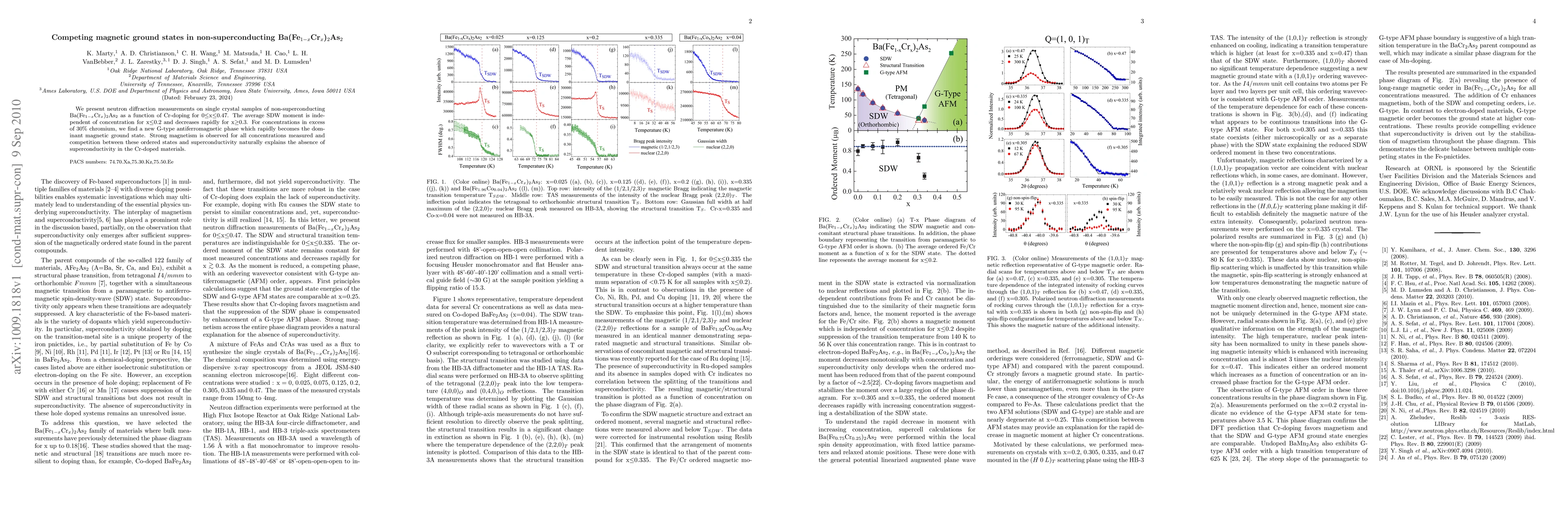 This study investigates the magnetic ground states in non-superconducting Ba(Fe1-xCrx)2As2 through neutron diffraction, revealing that SDW moments remain stable until 20% Cr-doping, after which a G-type antiferromagnetic phase emerges, explaining the suppression of superconductivity.