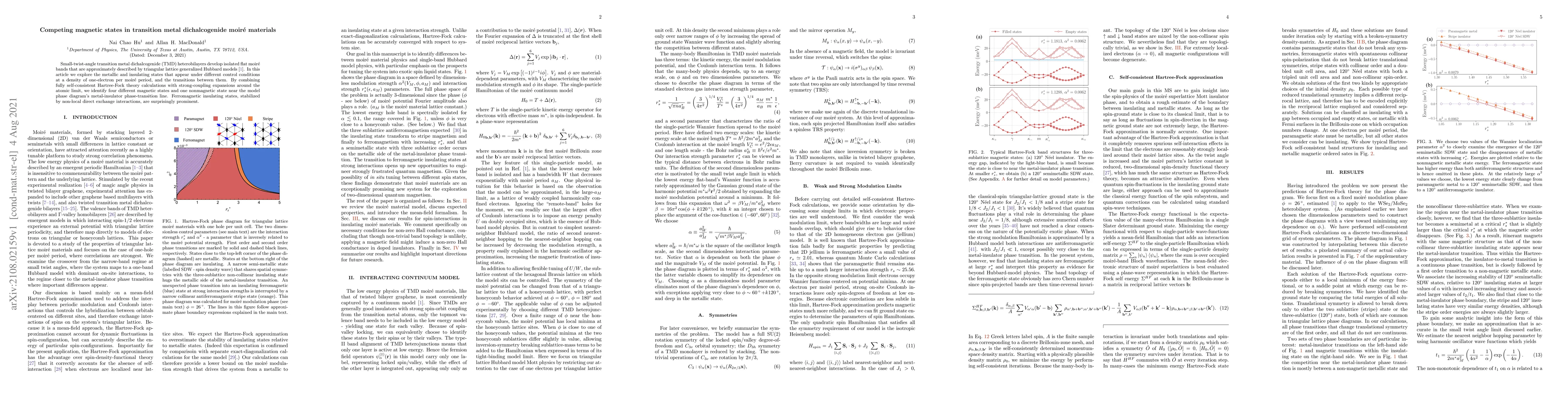 Small-twist-angle transition metal dichalcogenide (TMD) heterobilayers develop isolated flat moir\'e bands that are approximately described by triangular lattice generalized Hubbard models [PhysRevLett.121.026402]. In this article we explore the metallic and insulating states that appear under different control conditions at a density of one-electron per moir\'e period, and the transitions between them. By combining fully self-consistent Hartree-Fock theory calculations with strong-coupling expansions around the atomic limit, we identify four different magnetic states and one nonmagnetic state near the model phase diagram's metal-insulator phase-transition line. Ferromagnetic insulating states, stabilized by non-local direct exchange interactions, are surprisingly prominent.
