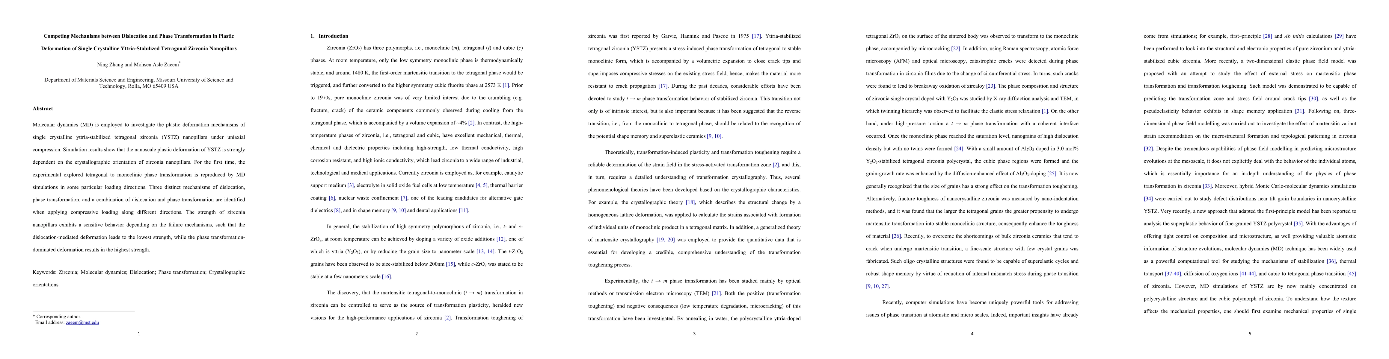 This study uses molecular dynamics simulations to explore plastic deformation in single crystalline yttria-stabilized tetragonal zirconia nanopillars, identifying three deformation mechanisms: dislocation, phase transformation, and a combination of both. The strength of the nanopillars varies significantly based on the dominant failure mechanism, with phase transformation yielding the highest strength.