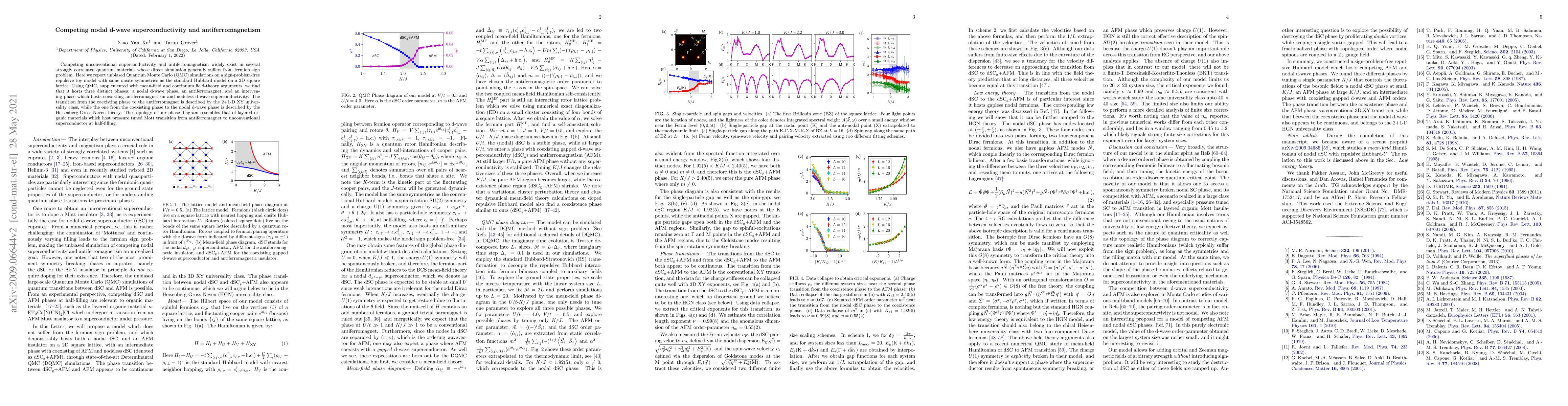 This study uses Quantum Monte Carlo simulations to explore a sign-problem-free model exhibiting competing nodal d-wave superconductivity and antiferromagnetism, revealing three distinct phases: nodal d-wave superconductivity, antiferromagnetism, and a coexisting phase. The transitions between these phases follow specific universality classes, resembling the behavior of layered organic materials.