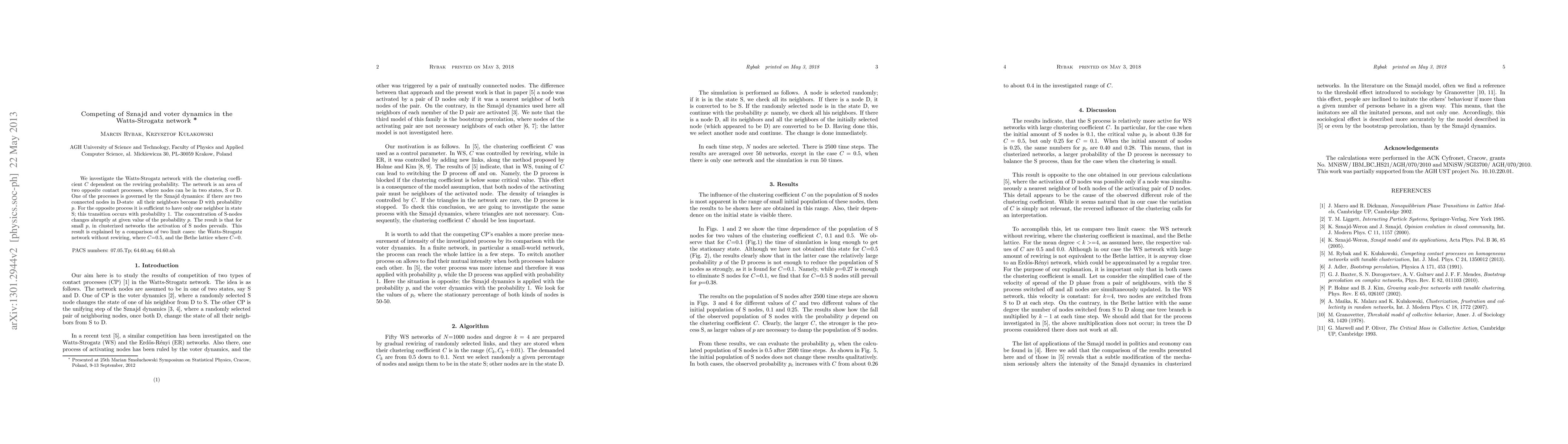 We investigate the Watts-Strogatz network with the clustering coefficient C dependent on the rewiring probability. The network is an area of two opposite contact processes, where nodes can be in two states, S or D. One of the processes is governed by the Sznajd dynamics: if there are two connected nodes in D-state, all their neighbors become D with probability p. For the opposite process it is sufficient to have only one neighbor in state S; this transition occurs with probability 1. The concentration of S-nodes changes abruptly at given value of the probability p. The result is that for small p, in clusterized networks the activation of S nodes prevails. This result is explained by a comparison of two limit cases: the Watts-Strogatz network without rewiring, where C=0.5, and the Bethe lattice where C=0.