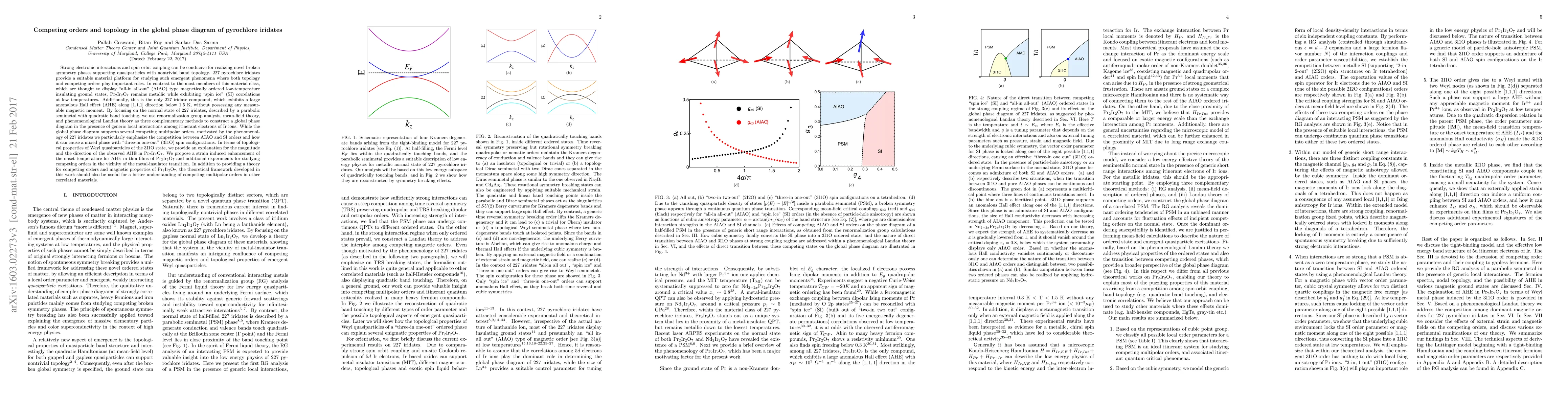 Strong electronic interactions and spin orbit coupling can be conducive for realizing novel broken symmetry phases supporting quasiparticles with nontrivial band topology. 227 pyrochlore iridates provide a suitable material platform for studying such emergent phenomena where both topology and competing orders play important roles. In contrast to the most members of this material class, which are thought to display "all-in all-out" (AIAO) type magnetically ordered low-temperature insulating ground states, Pr$_2$Ir$_2$O$_7$ remains metallic while exhibiting "spin ice" (SI) correlations at low temperatures. Additionally, this is the only 227 iridate compound, which exhibits a large anomalous Hall effect (AHE) along [1,1,1] direction below 1.5 K, without possessing any measurable magnetic moment. By focusing on the normal state of 227 iridates, described by a parabolic semimetal with quadratic band touching, we use renormalization group analysis, mean-field theory, and phenomenological Landau theory as three complementary methods to construct a global phase diagram in the presence of generic local interactions among itinerant electrons of Ir ions. While the global phase diagram supports several competing multipolar orders, motivated by the phenomenology of 227 iridates we particularly emphasize the competition between AIAO and SI orders and how it can cause a mixed phase with "three-in one-out" (3I1O) spin configurations. In terms of topological properties of Weyl quasiparticles of the 3I1O state, we provide an explanation for the magnitude and the direction of the observed AHE in Pr$_2$Ir$_2$O$_7$. We propose a strain induced enhancement of the onset temperature for AHE in thin films of Pr$_2$Ir$_2$O$_7$ and additional experiments for studying competing orders in the vicinity of the metal-insulator transition.