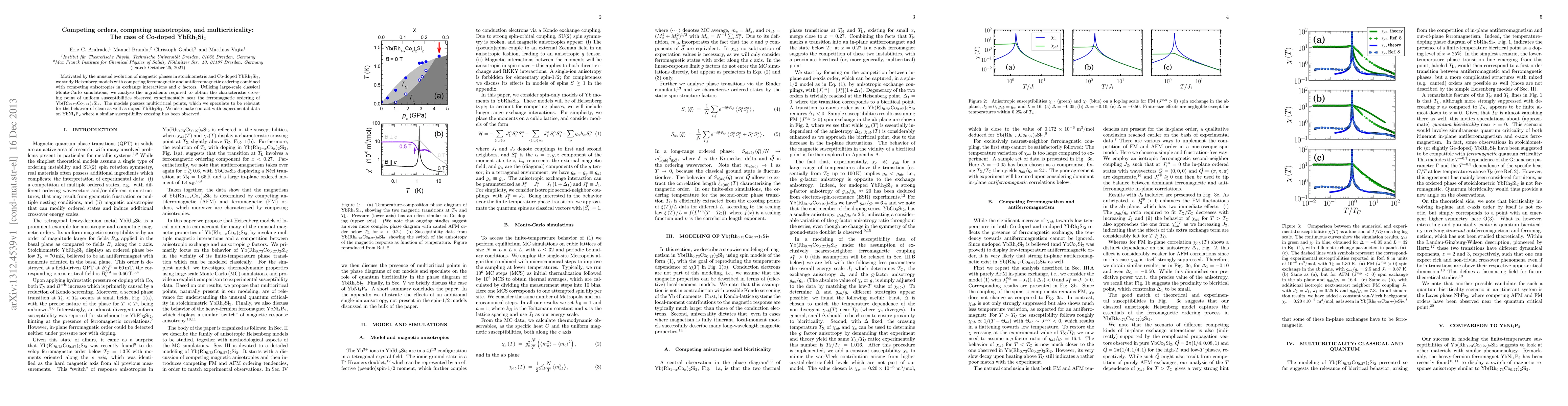 Motivated by the unusual evolution of magnetic phases in stoichiometric and Co-doped YbRh2Si2, we study Heisenberg models with competing ferromagnetic and antiferromagnetic ordering combined with competing anisotropies in exchange interactions and g factors. Utilizing large-scale classical Monte-Carlo simulations, we analyze the ingredients required to obtain the characteristic crossing point of uniform susceptibilities observed experimentally near the ferromagnetic ordering of Yb(Rh0.73Co0.27)2Si2. The models possess multicritical points, which we speculate to be relevant for the behavior of clean as well as doped YbRh2Si2. We also make contact with experimental data on YbNi4P2 where a similar susceptibility crossing has been observed.
