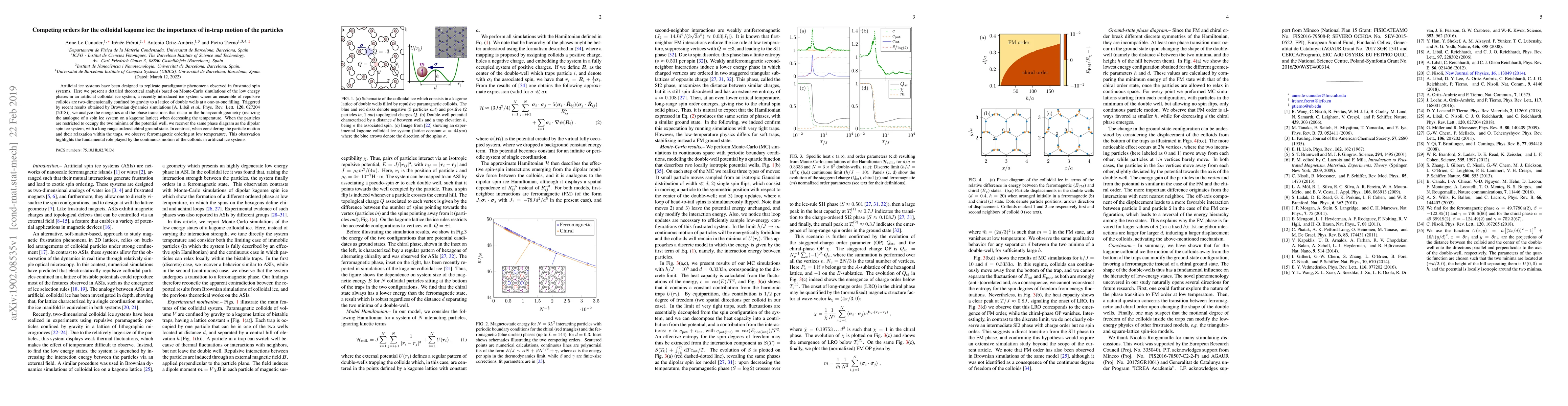 This paper presents a theoretical analysis of low energy phases in an artificial colloidal ice system using Monte-Carlo simulations, revealing that particle motion within traps leads to ferromagnetic ordering, contrasting with the long-range ordered chiral state when particles are restricted to potential well minima. The study underscores the importance of in-trap motion in determining the system's phase transitions.