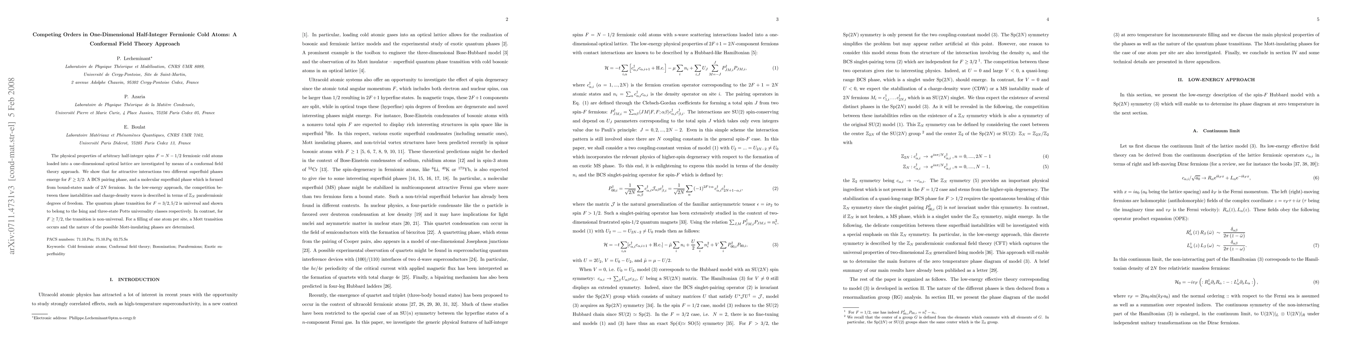 This paper explores the behavior of one-dimensional fermionic cold atoms with half-integer spin using conformal field theory, revealing two superfluid phases for attractive interactions and a universal quantum phase transition at specific spin values. The study also examines Mott insulating phases for a single atom per site.