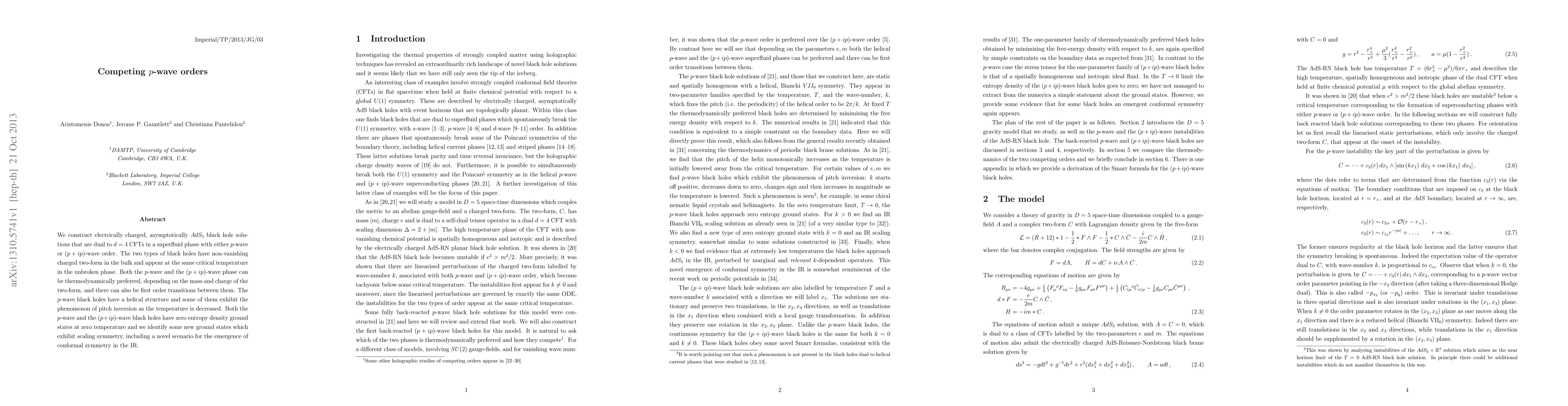 We construct electrically charged, asymptotically $AdS_5$ black hole solutions that are dual to $d=4$ CFTs in a superfluid phase with either p-wave or $(p+ip)$-wave order. The two types of black holes have non-vanishing charged two-form in the bulk and appear at the same critical temperature in the unbroken phase. Both the p-wave and the $(p+ip)$-wave phase can be thermodynamically preferred, depending on the mass and charge of the two-form, and there can also be first order transitions between them. The p-wave black holes have a helical structure and some of them exhibit the phenomenon of pitch inversion as the temperature is decreased. Both the p-wave and the $(p+ip)$-wave black holes have zero entropy density ground states at zero temperature and we identify some new ground states which exhibit scaling symmetry, including a novel scenario for the emergence of conformal symmetry in the IR.