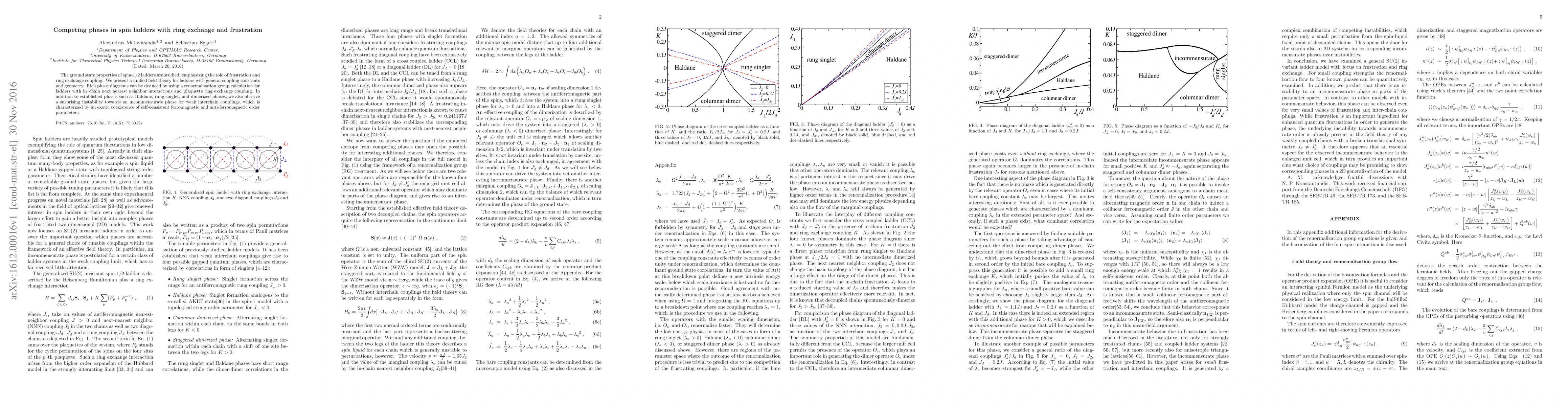 The ground state properties of spin-1/2 ladders are studied, emphasizing the role of frustration and ring exchange coupling. We present a unified field theory for ladders with general coupling constants and geometry. Rich phase diagrams can be deduced by using a renormalization group calculation for ladders with in--chain next nearest neighbor interactions and plaquette ring exchange coupling. In addition to established phases such as Haldane, rung singlet, and dimerized phases, we also observe a surprising instability towards an incommensurate phase for weak interchain couplings, which is characterized by an exotic coexistence of self-consistent ferromagnetic and anti-ferromagnetic order parameters.