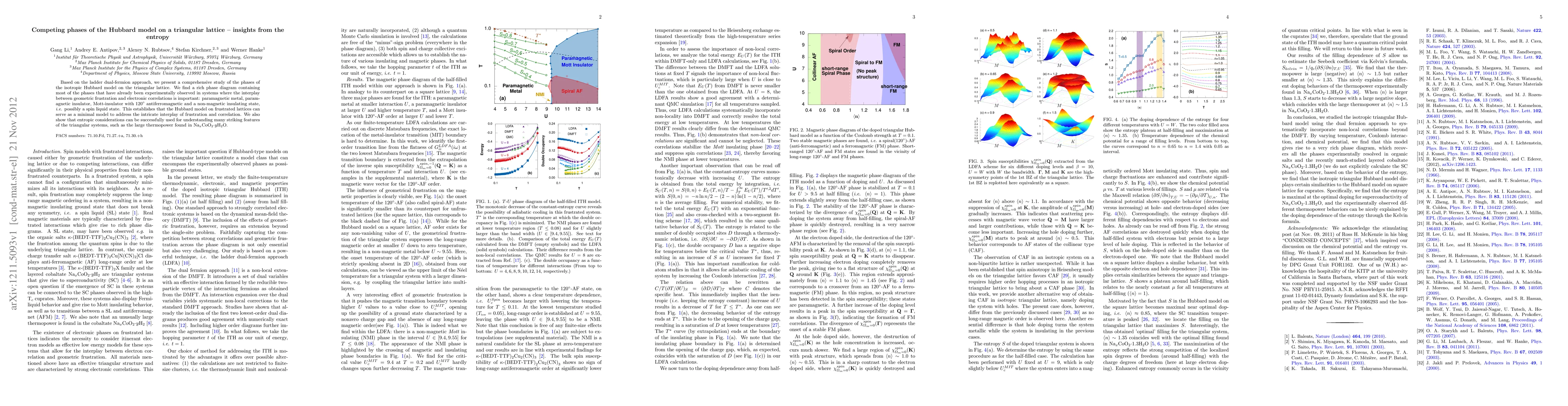 Based on the ladder dual-fermion approach, we present a comprehensive study of the phases of the isotropic Hubbard model on the triangular lattice. We find a rich phase diagram containing most of the phases that have already been experimentally observed in systems where the interplay between geometric frustration and electronic correlations is important: paramagnetic metal, paramagnetic insulator, Mott-insulator with $120^{\circ}$ antiferromagnetic and a non-magnetic insulating state, i.e. possibly a spin liquid state. This establishes that the Hubbard model on frustrated lattices can serve as a minimal model to address the intricate interplay of frustration and correlation. We also show that entropic considerations can be successfully used for understanding many striking features of the triangular systems, such as the large thermopower found in Na$_{x}$CoO$_{2}\cdot$$y$H$_{2}$O.