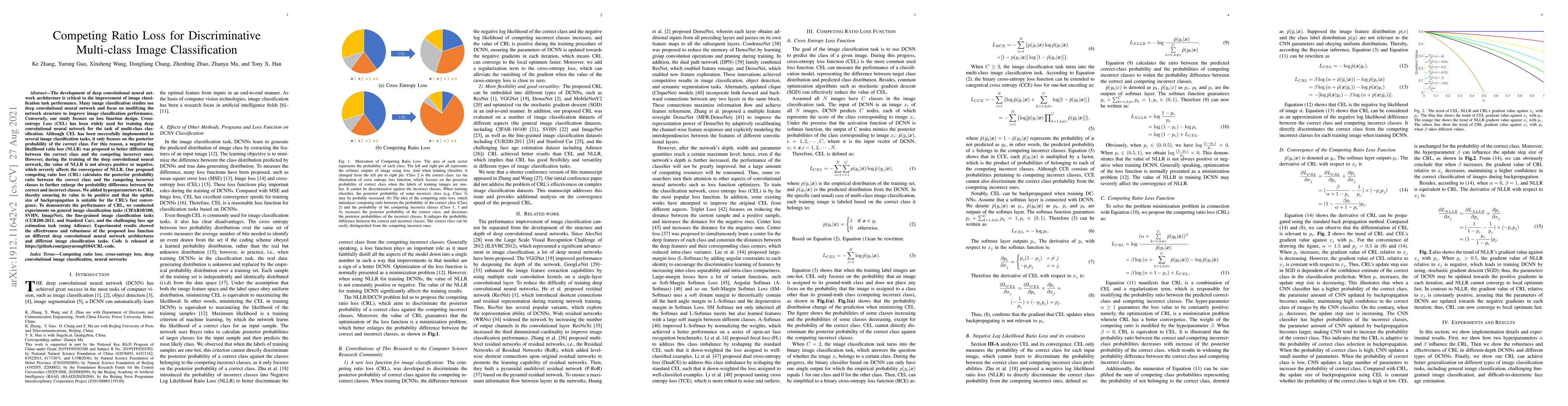 This paper proposes a competing ratio loss (CRL) to improve multi-class image classification performance by better differentiating between the correct class and competing incorrect classes. Unlike traditional cross-entropy loss, CRL calculates the ratio of posterior probabilities to enlarge the probability difference, ensuring positive values and suitable backpropagation update sizes for fast convergence. Experiments on various datasets show CRL's effectiveness and robustness.