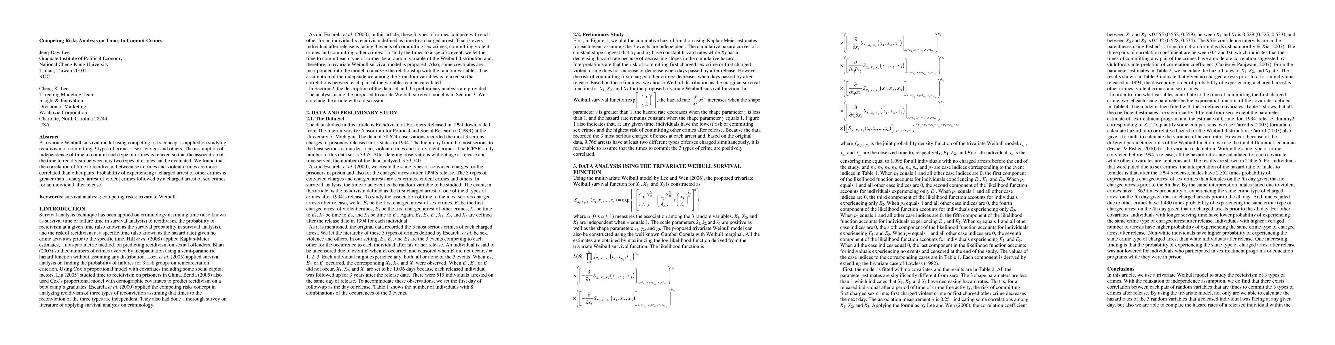 This study employs a trivariate Weibull survival model to analyze recidivism for three crime types, relaxing the assumption of independence to evaluate associations. Results show stronger correlation in recidivism time between sex and violent crimes compared to other pairs, and a higher probability of charged arrest for other crimes post-release.