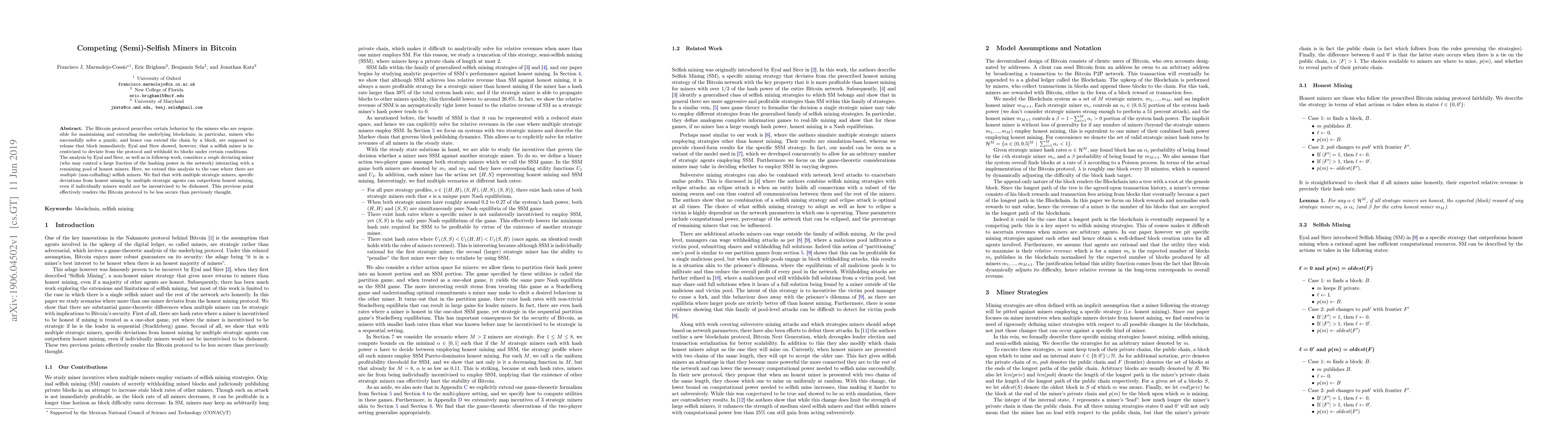 The Bitcoin protocol prescribes certain behavior by the miners who are responsible for maintaining and extending the underlying blockchain; in particular, miners who successfully solve a puzzle, and hence can extend the chain by a block, are supposed to release that block immediately. Eyal and Sirer showed, however, that a selfish miner is incentivized to deviate from the protocol and withhold its blocks under certain conditions. The analysis by Eyal and Sirer, as well as in followup work, considers a \emph{single} deviating miner (who may control a large fraction of the hashing power in the network) interacting with a remaining pool of honest miners. Here, we extend this analysis to the case where there are \emph{multiple} (non-colluding) selfish miners. We find that with multiple strategic miners, specific deviations from honest mining by multiple strategic agents can outperform honest mining, even if individually miners would not be incentivised to be dishonest. This previous point effectively renders the Bitcoin protocol to be less secure than previously thought.
