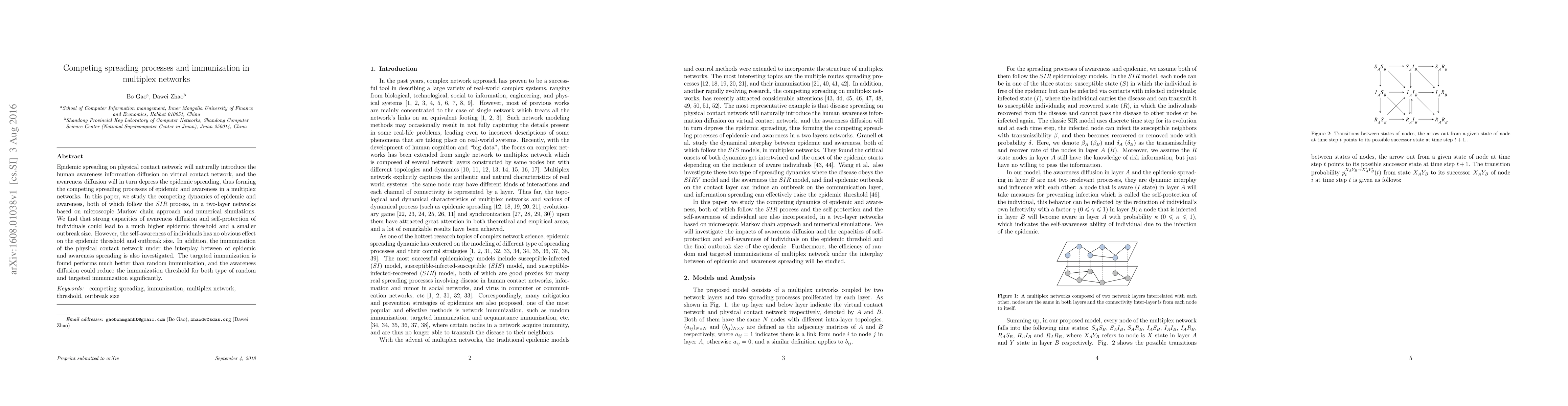 Epidemic spreading on physical contact network will naturally introduce the human awareness information diffusion on virtual contact network, and the awareness diffusion will in turn depress the epidemic spreading, thus forming the competing spreading processes of epidemic and awareness in a multiplex networks. In this paper, we study the competing dynamics of epidemic and awareness, both of which follow the SIR process, in a two-layer networks based on microscopic Markov chain approach and numerical simulations. We find that strong capacities of awareness diffusion and self-protection of individuals could lead to a much higher epidemic threshold and a smaller outbreak size. However, the self-awareness of individuals has no obvious effect on the epidemic threshold and outbreak size. In addition, the immunization of the physical contact network under the interplay between of epidemic and awareness spreading is also investigated. The targeted immunization is found performs much better than random immunization, and the awareness diffusion could reduce the immunization threshold for both type of random and targeted immunization significantly.