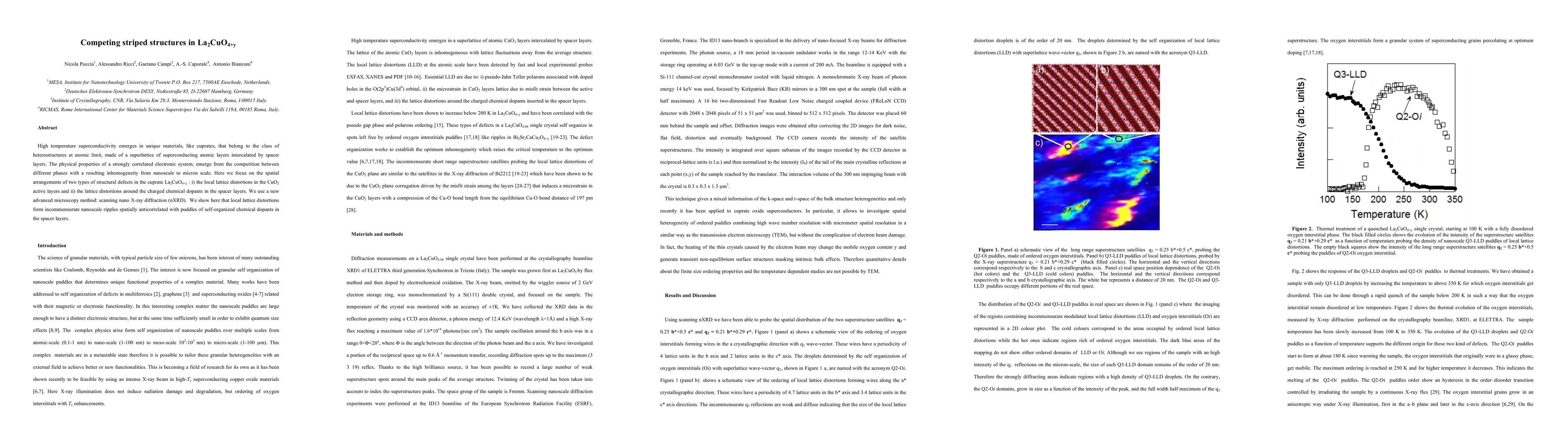 High temperature superconductivity emerges in unique materials, like cuprates, that belong to the class of heterostructures at atomic limit, made of a superlattice of superconducting atomic layers intercalated by spacer layers. The physical properties of a strongly correlated electronic system, emerge from the competition between different phases with a resulting inhomogeneity from nanoscale to micron scale. Here we focus on the spatial arrangements of two types of structural defects in the cuprate La2CuO4+y : i) the local lattice distortions in the CuO2 active layers and ii) the lattice distortions around the charged chemical dopants in the spacer layers. We use a new advanced microscopy method: scanning nano X-ray diffraction (nXRD). We show here that local lattice distortions form incommensurate nanoscale ripples spatially anticorrelated with puddles of self-organized chemical dopants in the spacer layers.