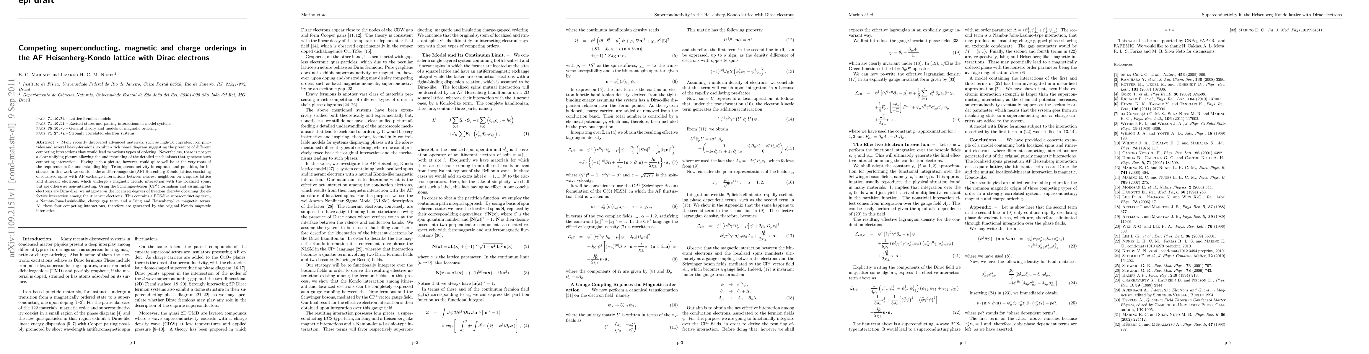 Many recently discovered advanced materials, such as high-Tc cuprates, iron pnictides and several heavy-fermions, exhibit a rich phase diagram suggesting the presence of different competing interactions that would lead to various types of ordering. Nevertheless, there is not yet a clear unifying picture allowing the understanding of the detailed mechanisms that generate such competing interactions. Having such a picture, however, could quite well be at the very roots of the requirements for understanding high-Tc superconductivity in cuprates and pnictides, for instance. In this work we consider the antiferromagnetic (AF) Heisenberg-Kondo lattice, consisting of localized spins with AF exchange interactions between nearest neighbors on a square lattice and itinerant electrons, which undergo a magnetic Kondo interaction with the localized spins, but are otherwise non-interacting. Using the Schwinger-boson (CP$^1$) formalism and assuming the electrons are Dirac-like, we integrate on the localized degrees of freedom thereby obtaining the effective interaction among the itinerant electrons. This contains a BCS-like superconducting term, a Nambu-Jona-Lasinio-like, charge gap term and a Ising and Heisenberg-like magnetic terms. All these four competing interactions, therefore are generated by the original Kondo magnetic interaction.