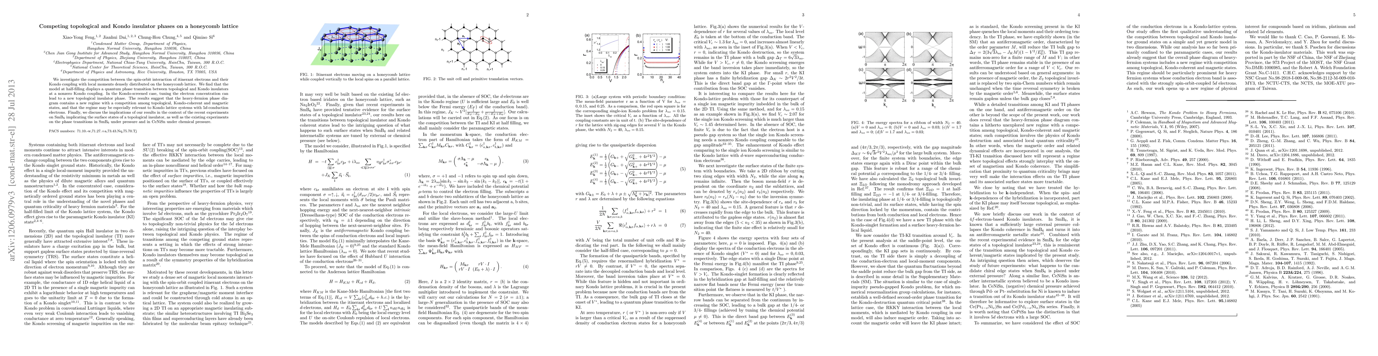 We investigate the competition between the spin-orbit interaction of itinerant electrons and their Kondo coupling with local moments densely distributed on the honeycomb lattice. We find that the model at half-filling displays a quantum phase transition between topological and Kondo insulators at a nonzero Kondo coupling. In the Kondo-screened case, tuning the electron concentration can lead to a new topological insulator phase. The results suggest that the heavy-fermion phase diagram contains a new regime with a competition among topological, Kondo-coherent and magnetic states, and that the regime may be especially relevant to Kondo lattice systems with $5d$-conduction electrons. Finally, we discuss the implications of our results in the context of the recent experiments on SmB$_6$ implicating the surface states of a topological insulator, as well as the existing experiments on the phase transitions in SmB$_6$ under pressure and in CeNiSn under chemical pressure.