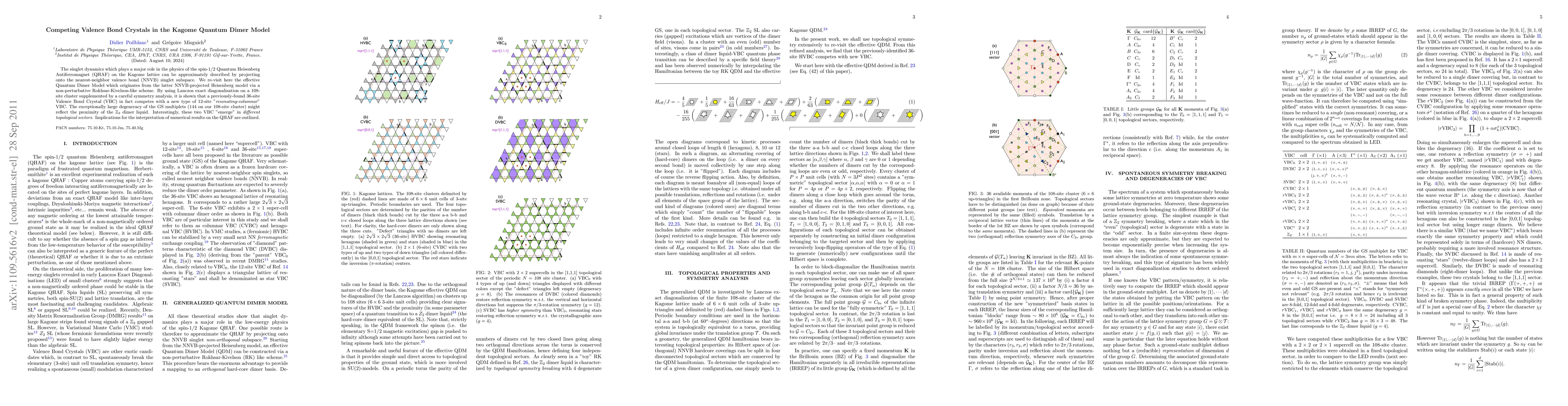 The singlet dynamics which plays a major role in the physics of the spin-1/2 Quantum Heisenberg Antiferromagnet (QHAF) on the Kagome lattice can be approximately described by projecting onto the nearest-neighbor valence bond (NNVB) singlet subspace. We re-visit here the effective Quantum Dimer Model which originates from the latter NNVB-projected Heisenberg model via a non-perturbative Rokhsar-Kivelson-like scheme. By using Lanczos exact diagonalisation on a 108-site cluster supplemented by a careful symmetry analysis, it is shown that a previously-found 36-site Valence Bond Crystal (VBC) in fact competes with a new type of 12-site "{\it resonating-columnar}" VBC. The exceptionally large degeneracy of the GS multiplets (144 on our 108-site cluster) might reflect the proximity of the Z_2 dimer liquid. Interestingly, these two VBC "emerge" in {\it different topological sectors}. Implications for the interpretation of numerical results on the QHAF are outlined.