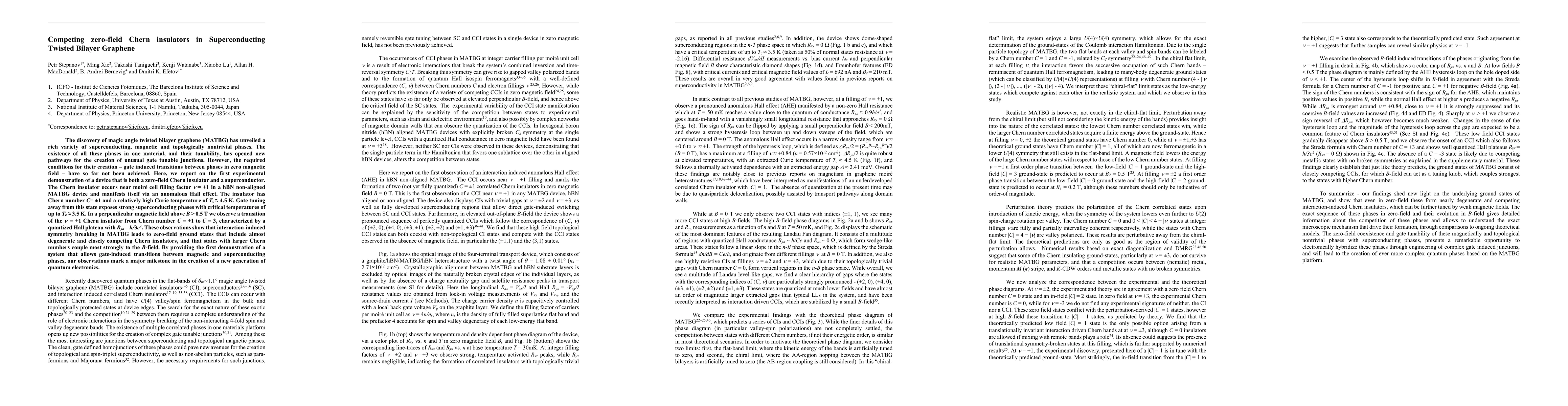 This paper reports the first experimental demonstration of a superconducting twisted bilayer graphene device functioning as a zero-field Chern insulator, exhibiting an anomalous Hall effect near moiré cell filling factor v = +1. The device shows competing zero-field Chern insulators and superconducting phases, marking a significant step towards advanced quantum electronic devices.