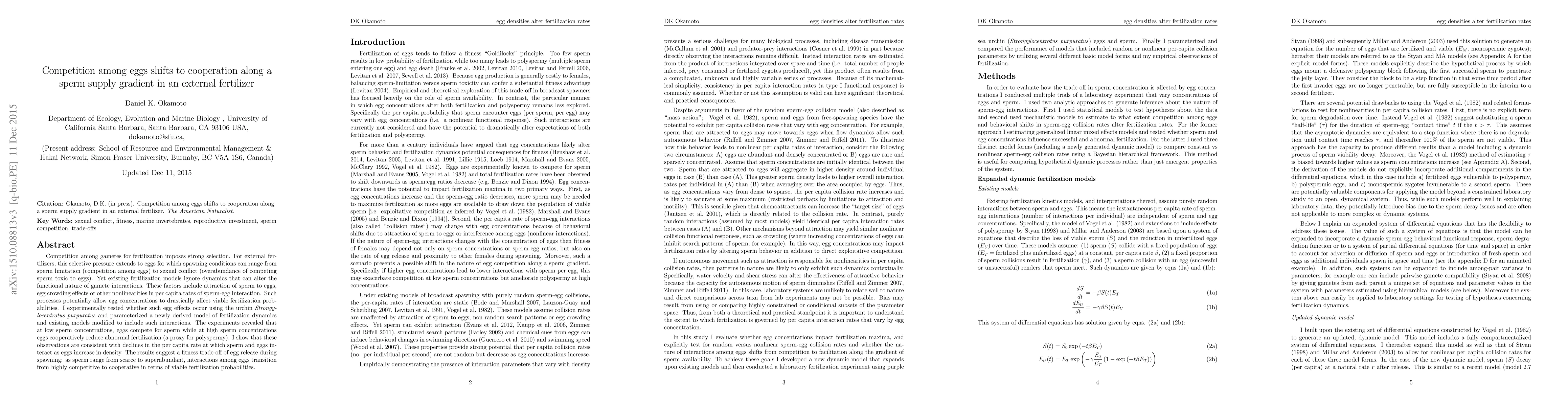 This study investigates how competition among eggs for fertilization shifts to cooperation along a sperm supply gradient in external fertilizers, using the urchin $\textit{Strongylocentrotus purpuratus}$. The research reveals that eggs compete for sperm when sperm is limited but cooperate to reduce abnormal fertilization when sperm is abundant, demonstrating a fitness trade-off in egg release strategies.