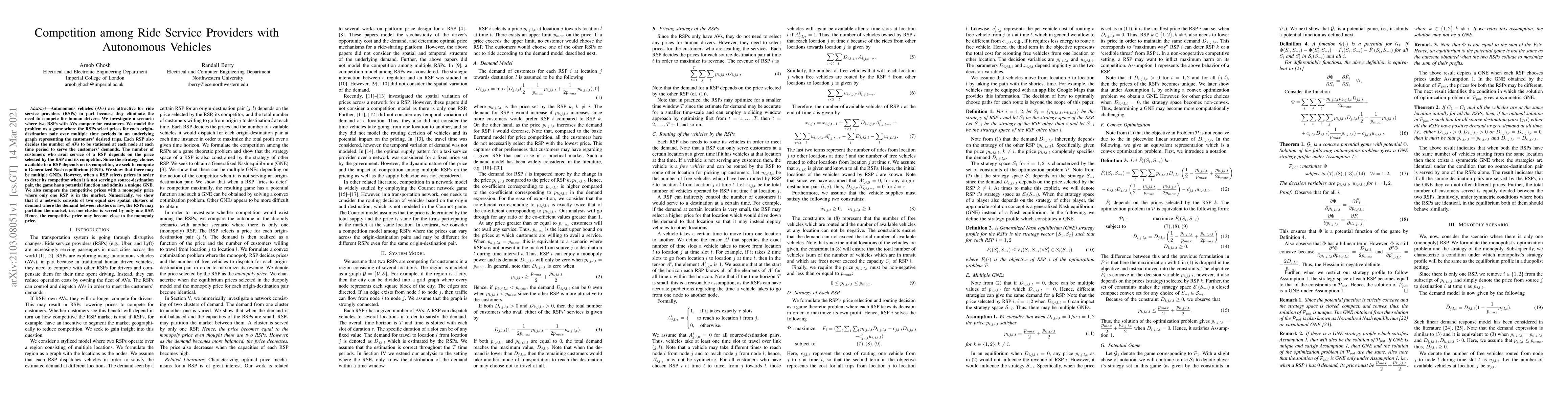 Autonomous vehicles (AVs) are attractive for ride service providers (RSPs) in part because they eliminate the need to compete for human drivers. We investigate a scenario where two RSPs with AVs compete for customers. We model the problem as a game where the RSPs select prices for each origin-destination pair over multiple time periods in an underlying graph representing the customers' desired trips. Each RSP also decides the number of AVs to be stationed at each node at each time period to serve the customers' demands. The number of customers who avail of the service of an RSP depends on the price selected by the RSP and its competitor. Since the strategy choices available to an RSP depends on its competitor, we seek to compute a Generalized Nash equilibrium (GNE). We show that there may be multiple GNEs. However, when an RSP selects prices in order to deter its competitor when it is not serving a source-destination pair, the game has a potential function and admits a unique GNE. We also compare the competitive prices with a monopoly price where only one RSP is in the market. Numerically, we show that if a network consists of two equal-size spatial clusters of demand where the demand between clusters is low, the RSPs may partition the market, i.e, one cluster is served by only one RSP. Hence, the competitive price may become close to the monopoly price.