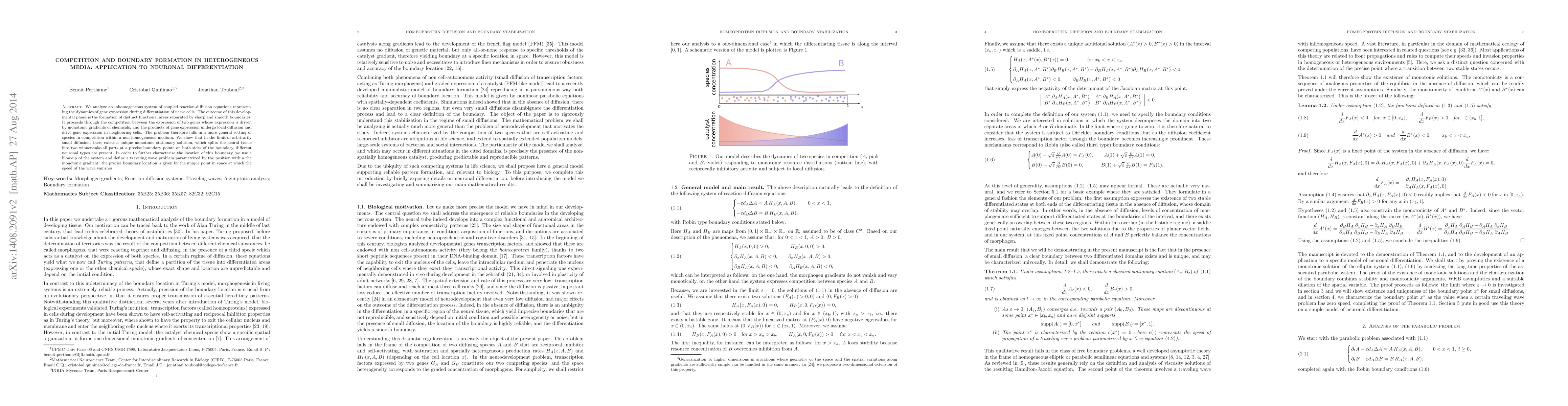 We analyze an inhomogeneous system of coupled reaction-diffusion equations representing the dynamics of gene expression during differentiation of nerve cells. The outcome of this developmental phase is the formation of distinct functional areas separated by sharp and smooth boundaries. It proceeds through the competition between the expression of two genes whose expression is driven by monotonic gradients of chemicals, and the products of gene expression undergo local diffusion and drive gene expression in neighboring cells. The problem therefore falls in a more general setting of species in competition within a non-homogeneous medium. We show that in the limit of arbitrarily small diffusion, there exists a unique monotonic stationary solution, which splits the neural tissue into two winner-take-all parts at a precise boundary point: on both sides of the boundary, different neuronal types are present. In order to further characterize the location of this boundary, we use a blow-up of the system and define a traveling wave problem parametrized by the position within the monotonic gradient: the precise boundary location is given by the unique point in space at which the speed of the wave vanishes.