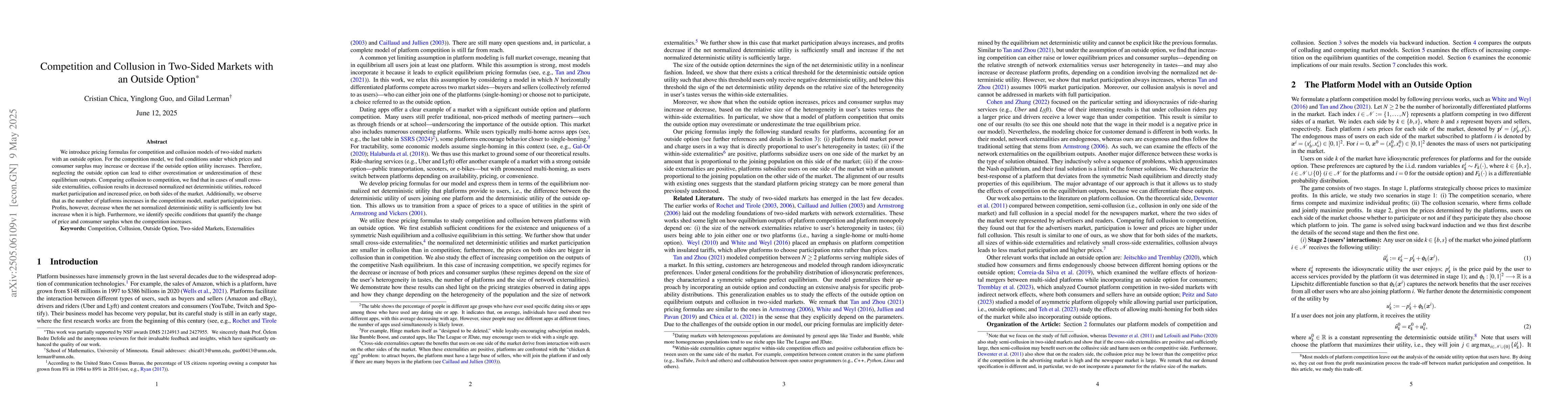 The paper introduces pricing formulas for competition and collusion models in two-sided markets with an outside option, analyzing conditions under which prices and consumer surplus change.
