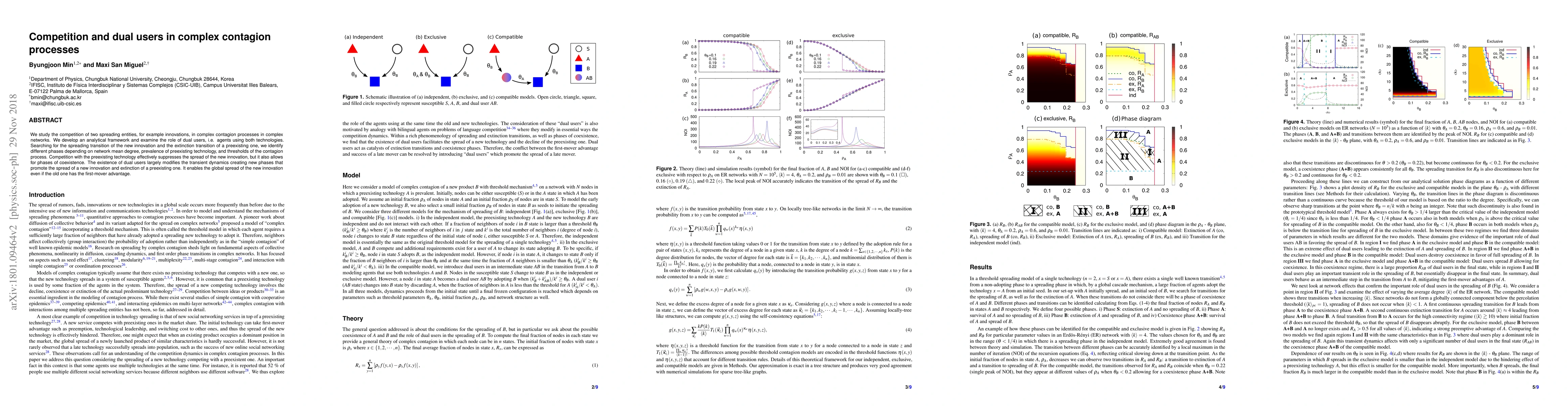 The research develops an analytical framework for studying the competition of two spreading entities in complex contagion processes on complex networks, examining the role of dual users who employ both technologies.