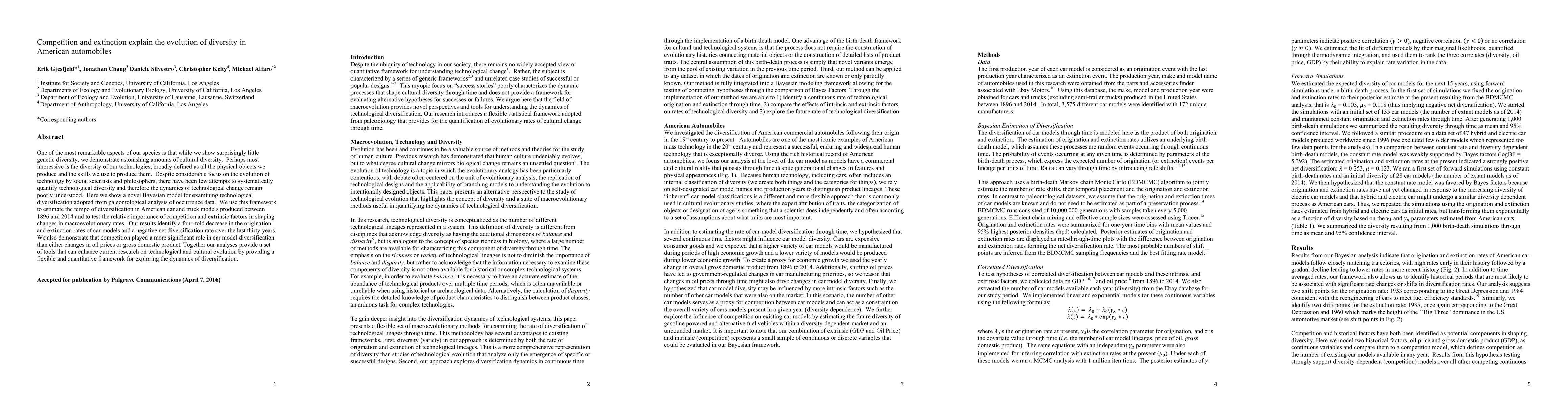 One of the most remarkable aspects of our species is that while we show surprisingly little genetic diversity, we demonstrate astonishing amounts of cultural diversity. Perhaps most impressive is the diversity of our technologies, broadly defined as all the physical objects we produce and the skills we use to produce them. Despite considerable focus on the evolution of technology by social scientists and philosophers, there have been few attempts to systematically quantify technological diversity and therefore the dynamics of technological change remain poorly understood. Here we show a novel Bayesian model for examining technological diversification adopted from paleontological analysis of occurrence data. We use this framework to estimate the tempo of diversification in American car and truck models produced between 1896 and 2014 and to test the relative importance of competition and extrinsic factors in shaping changes in macroevolutionary rates. Our results identify a four-fold decrease in the origination and extinction rates of car models and a negative net diversification rate over the last thirty years. We also demonstrate that competition played a more significant role in car model diversification than either changes in oil prices or gross domestic product. Together our analyses provide a set of tools that can enhance current research on technological and cultural evolution by providing a flexible and quantitative framework for exploring the dynamics of diversification.