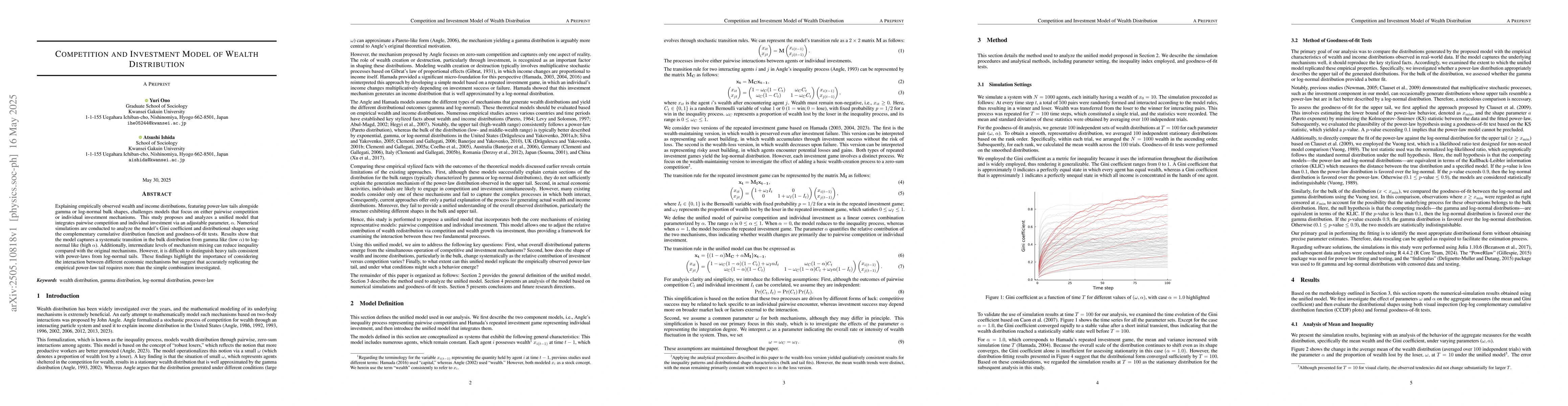 The research proposes a unified model integrating pairwise competition and individual investment via an adjustable parameter, $\alpha$, and analyzes it through numerical simulations focusing on the Gini coefficient and distributional shapes.