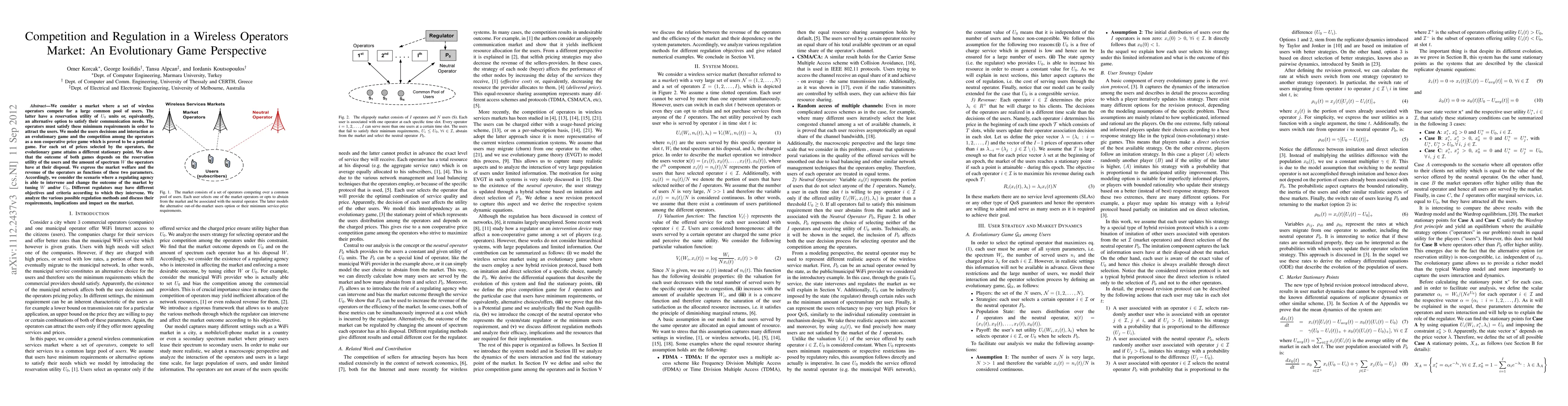 We consider a wireless services market where a set of operators compete for a large common pool of users. The latter have a reservation utility of U0 units or, equivalently, an alternative option to satisfy their communication needs. The operators must satisfy these minimum requirements in order to attract the users. We model the users decisions and interaction as an evolutionary game and the competition among the operators as a non cooperative price game which is proved to be a potential game. For each set of prices selected by the operators, the evolutionary game attains a different stationary point. We show that the outcome of both games depend on the reservation utility of the users and the amount of spectrum W the operators have at their disposal. We express the market welfare and the revenue of the operators as functions of these two parameters. Accordingly, we consider the scenario where a regulating agency is able to intervene and change the outcome of the market by tuning W and/or U0. Different regulators may have different objectives and criteria according to which they intervene. We analyze the various possible regulation methods and discuss their requirements, implications and impact on the market.