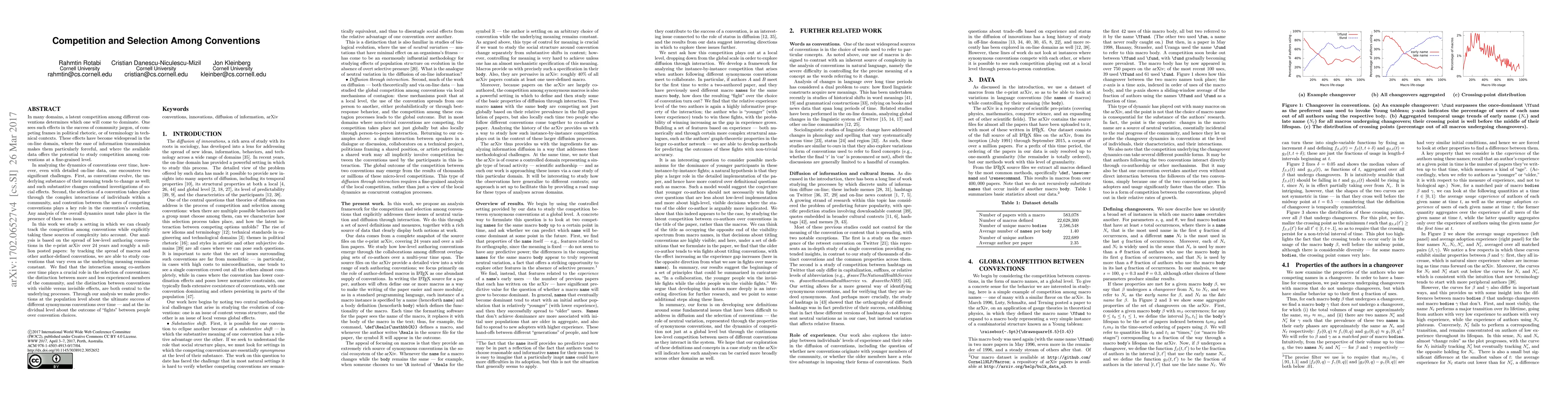 This paper investigates the competition and selection among conventions in the arXiv eprint archive, focusing on author-defined conventions like macros over 24 years. The study reveals that interactions among co-authors, especially the experience level and visibility of effects, critically influence the adoption and dominance of conventions.