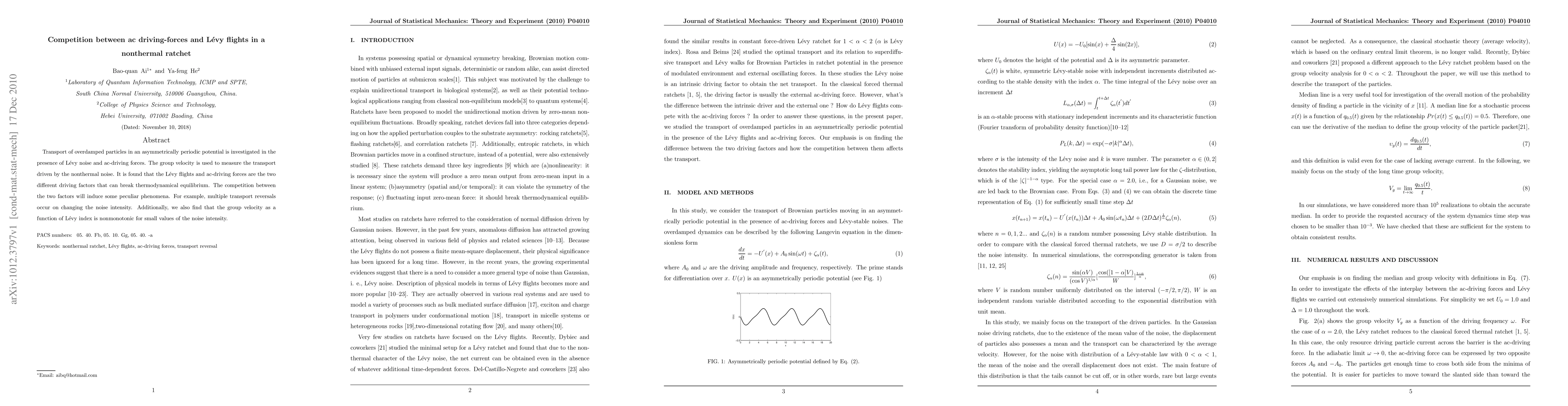 This paper investigates the transport of particles in an asymmetrically periodic potential under the influence of Lévy noise and ac-driving forces, revealing that both factors can disrupt thermodynamic equilibrium. The study finds that the competition between Lévy flights and ac-driving forces leads to unique phenomena such as multiple transport reversals and nonmonotonic group velocity as a function of Lévy index at low noise intensities.