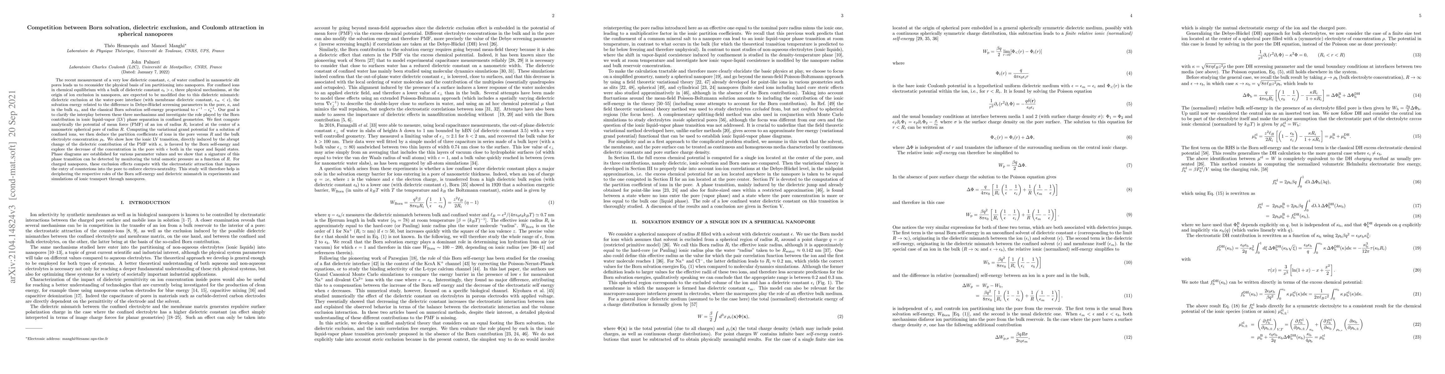 The recent measurement of a very low dielectric constant, $\epsilon$, of water confined in nanometric slit pores leads us to reconsider the physical basis of ion partitioning into nanopores. For confined ions in chemical equilibrium with a bulk of dielectric constant $\epsilon_b>\epsilon$, three physical mechanisms, at the origin of ion exclusion in nanopores, are expected to be modified due to this dielectric mismatch: dielectric exclusion at the water-pore interface (with membrane dielectric constant, $\epsilon_m<\epsilon$), the solvation energy related to the difference in Debye-H\"uckel screening parameters in the pore, $\kappa$, and in the bulk $\kappa_b$, and the classical Born solvation self-energy proportional to $\epsilon^{-1}-\epsilon_b^{-1}$. Our goal is to clarify the interplay between these three mechanisms and investigate the role played by the Born contribution in ionic liquid-vapor (LV) phase separation in confined geometries. We first compute analytically the potential of mean force (PMF) of an ion of radius $R_i$ located at the center of a nanometric spherical pore of radius $R$. Computing the variational grand potential for a solution of confined ions, we then deduce the partition coefficients of ions in the pore. Phase diagrams of the LV transition are established for various parameter values and we show that a signature of this phase transition can be detected by monitoring the total osmotic pressure. For charged nanopores, these exclusion effects compete with the electrostatic attraction that imposes the entry of counterions into the pore to enforce electro-neutrality. This study will therefore help in deciphering the respective roles of the Born self-energy and dielectric mismatch in experiments and simulations of ionic transport through nanopores.