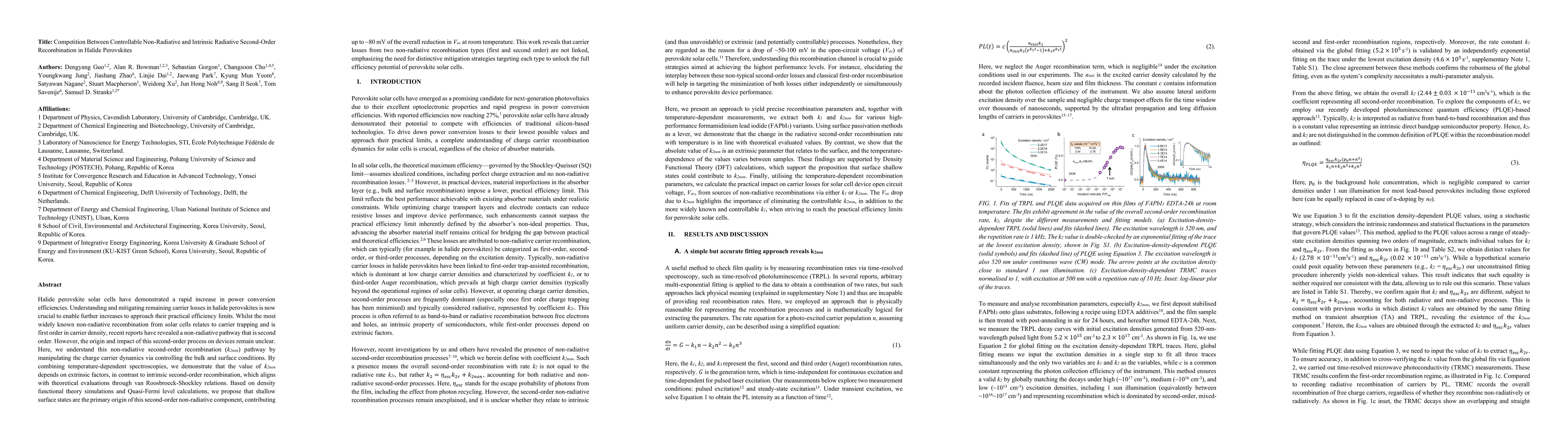 Halide perovskite solar cells have demonstrated a rapid increase in power conversion efficiencies. Understanding and mitigating remaining carrier losses in halide perovskites is now crucial to enable further increases to approach their practical efficiency limits. Whilst the most widely known non-radiative recombination from solar cells relates to carrier trapping and is first order in carrier density, recent reports have revealed a non-radiative pathway that is second order. However, the origin and impact of this second-order process on devices remain unclear. Here, we understand this non-radiative second-order recombination (k2non) pathway by manipulating the charge carrier dynamics via controlling the bulk and surface conditions. By combining temperature-dependent spectroscopies, we demonstrate that the value of k2non depends on extrinsic factors, in contrast to intrinsic second-order recombination, which aligns with theoretical evaluations through van Roosbroeck-Shockley relations. Based on density functional theory simulations and Quasi-Fermi level calculations, we propose that shallow surface states are the primary origin of this second-order non-radiative component, contributing up to ~80 mV of the overall reduction in Voc at room temperature. This work reveals that carrier losses from two non-radiative recombination types (first and second order) are not linked, emphasizing the need for distinctive mitigation strategies targeting each type to unlock the full efficiency potential of perovskite solar cells.