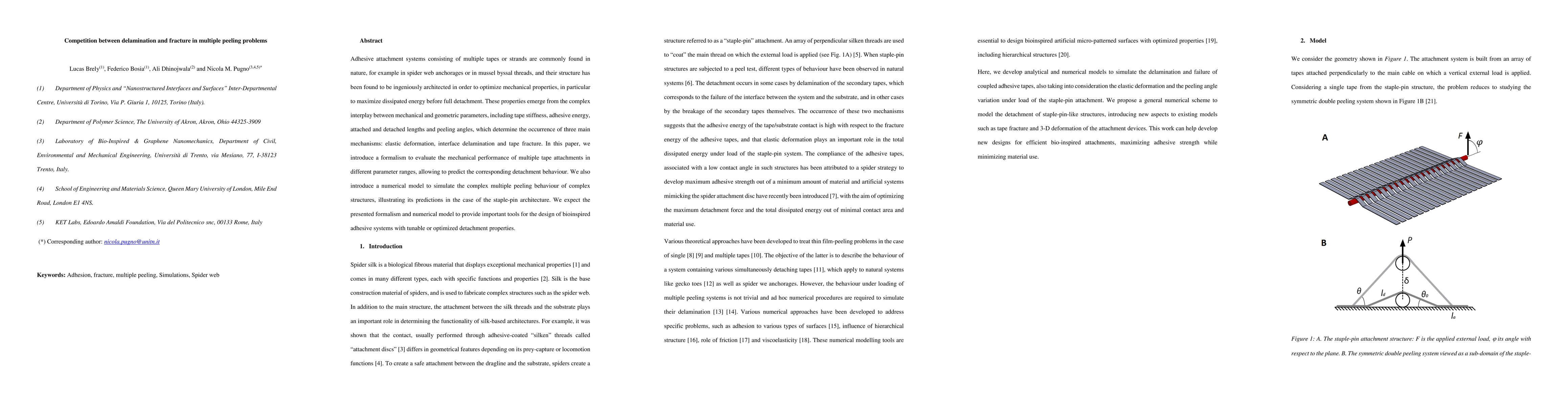 Adhesive attachment systems consisting of multiple tapes or strands are commonly found in nature, for example in spider web anchorages or in mussel byssal threads, and their structure has been found to be ingeniously architected in order to optimize mechanical properties, in particular to maximize dissipated energy before full detachment. These properties emerge from the complex interplay between mechanical and geometric parameters, including tape stiffness, adhesive energy, attached and detached lengths and peeling angles, which determine the occurrence of three main mechanisms: elastic deformation, interface delamination and tape fracture. In this paper, we introduce a formalism to evaluate the mechanical performance of multiple tape attachments in different parameter ranges, allowing to predict the corresponding detachment behaviour. We also introduce a numerical model to simulate the complex multiple peeling behaviour of complex structures, illustrating its predictions in the case of the staple-pin architecture. We expect the presented formalism and numerical model to provide important tools for the design of bioinspired adhesive systems with tunable or optimized detachment properties.