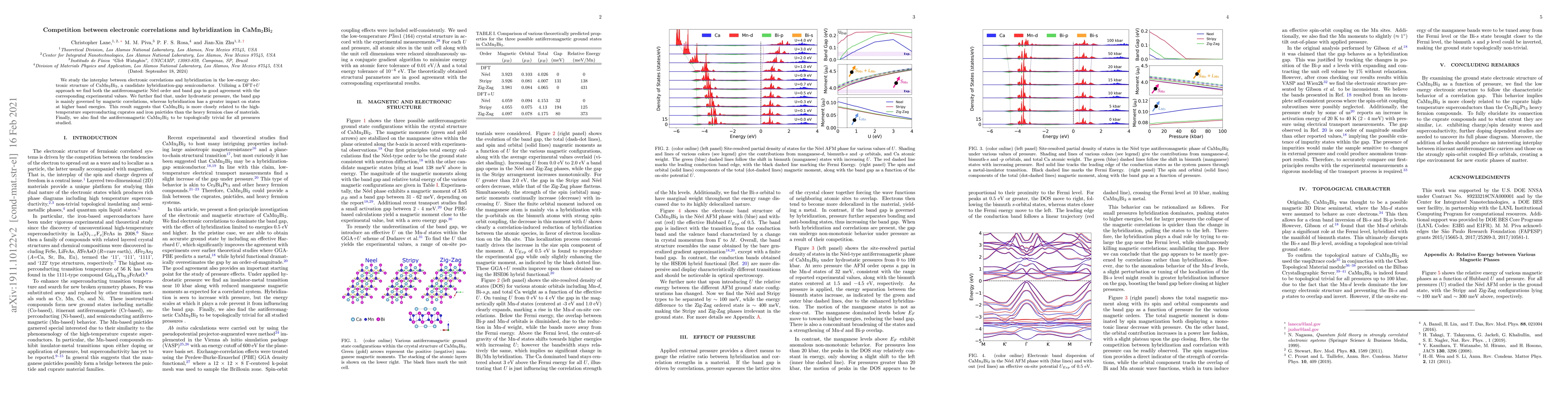 We study the interplay between electronic correlations and hybridization in the low-energy electronic structure of CaMn$_2$Bi$_2$, a candidate hybridization-gap semiconductor. Utilizing a DFT+$U$ approach we find both the antiferromagnetic N\'eel order and band gap in good agreement with the corresponding experimental values. We further find that, under hydrostatic pressure, the band gap is mainly governed by magnetic correlations, whereas hybridization has a greater impact on states at higher band energies. This result suggests that CaMn$_2$Bi$_2$ is more closely related to the high-temperature superconducting cuprates and iron pnictides than the heavy fermion class of materials. Finally, we also find the antiferromagnetic CaMn$_2$Bi$_2$ to be topologically trivial for all pressures studied.