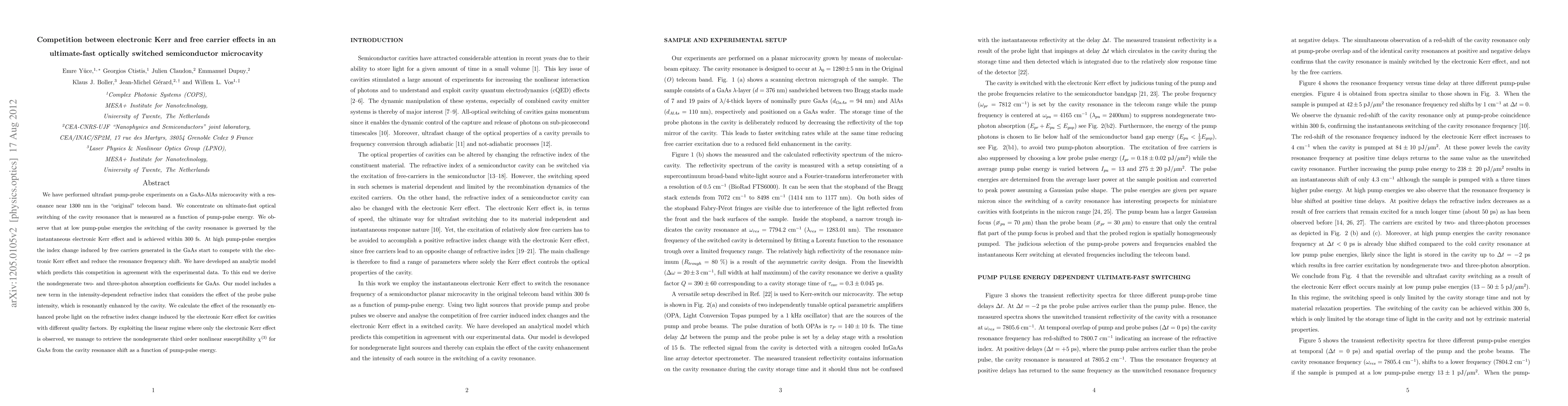 We have performed ultrafast pump-probe experiments on a GaAs-AlAs microcavity with a resonance near 1300 nm in the "original" telecom band. We concentrate on ultimate-fast optical switching of the cavity resonance that is measured as a function of pump-pulse energy. We observe that at low pump-pulse energies the switching of the cavity resonance is governed by the instantaneous electronic Kerr effect and is achieved within 300 fs. At high pump-pulse energies the index change induced by free carriers generated in the GaAs start to compete with the electronic Kerr effect and reduce the resonance frequency shift. We have developed an analytic model which predicts this competition in agreement with the experimental data. Our model includes a new term in the intensity-dependent refractive index that considers the effect of the probe pulse intensity, which is resonantly enhanced by the cavity. We calculate the effect of the resonantly enhanced probe light on the refractive index change induced by the electronic Kerr effect for cavities with different quality factors. By exploiting the linear regime where only the electronic Kerr effect is observed, we manage to retrieve the nondegenerate third order nonlinear susceptibility for GaAs from the cavity resonance shift as a function of pump-pulse energy.