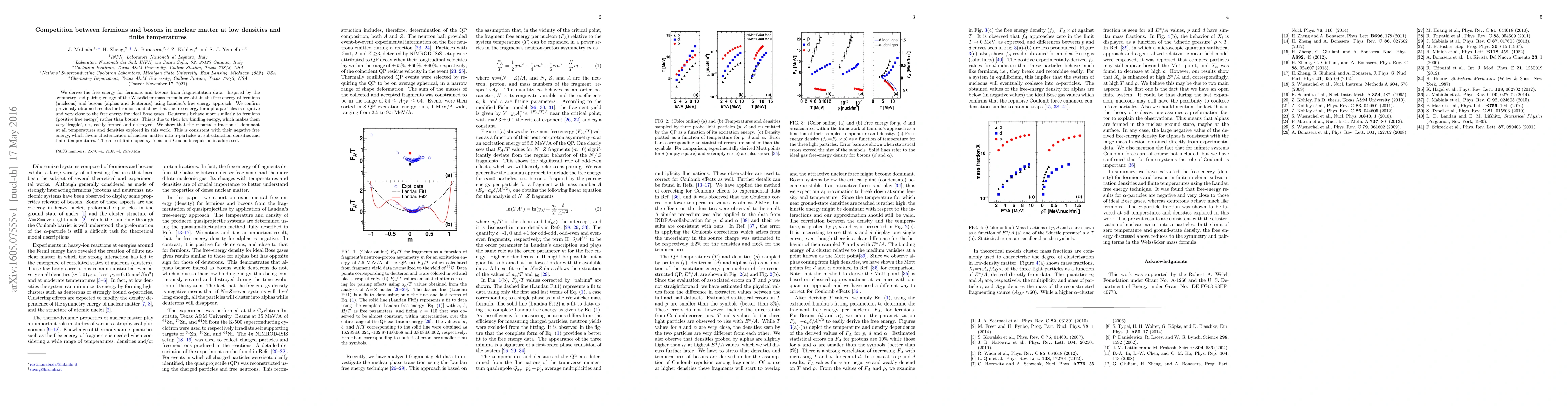 We derive the free energy for fermions and bosons from fragmentation data. Inspired by the symmetry and pairing energy of the Weizsacker mass formula we obtain the free energy of fermions (nucleons) and bosons (alphas and deuterons) using Landau's free energy approach. We confirm previously obtained results for fermions and show that the free energy for alpha particles is negative and very close to the free energy for ideal Bose gases. Deuterons behave more similarly to fermions (positive free energy) rather than bosons. This is due to their low binding energy, which makes them very 'fragile', i.e., easily formed and destroyed. We show that the {\alpha}-particle fraction is dominant at all temperatures and densities explored in this work. This is consistent with their negative free energy, which favors clusterization of nuclear matter into {\alpha}-particles at subsaturation densities and finite temperatures. The role of finite open systems and Coulomb repulsion is addressed.