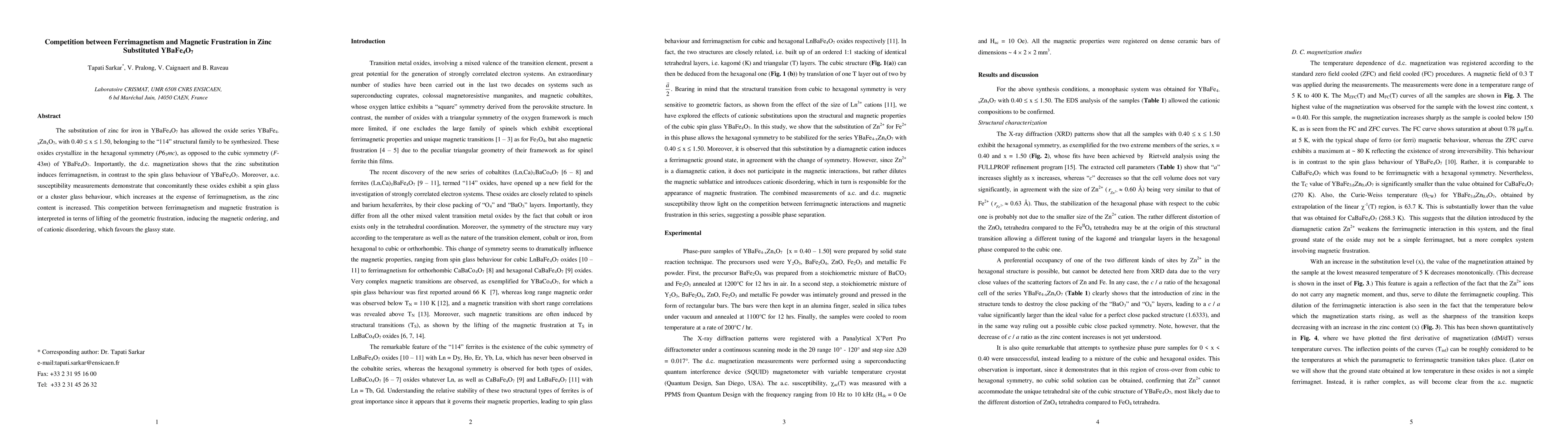 The substitution of zinc for iron in YBaFe4O7 has allowed the oxide series YBaFe4-xZnxO7, with 0.40 < x < 1.50, belonging to the "114" structural family to be synthesized. These oxides crystallize in the hexagonal symmetry (P63mc), as opposed to the cubic symmetry (F-43m) of YBaFe4O7. Importantly, the d.c. magnetization shows that the zinc substitution induces ferrimagnetism, in contrast to the spin glass behaviour of YBaFe4O7. Moreover, a.c. susceptibility measurements demonstrate that concomitantly these oxides exhibit a spin glass or a cluster glass behaviour, which increases at the expense of ferrimagnetism, as the zinc content is increased. This competition between ferrimagnetism and magnetic frustration is interpreted in terms of lifting of the geometric frustration, inducing the magnetic ordering, and of cationic disordering, which favours the glassy state.
