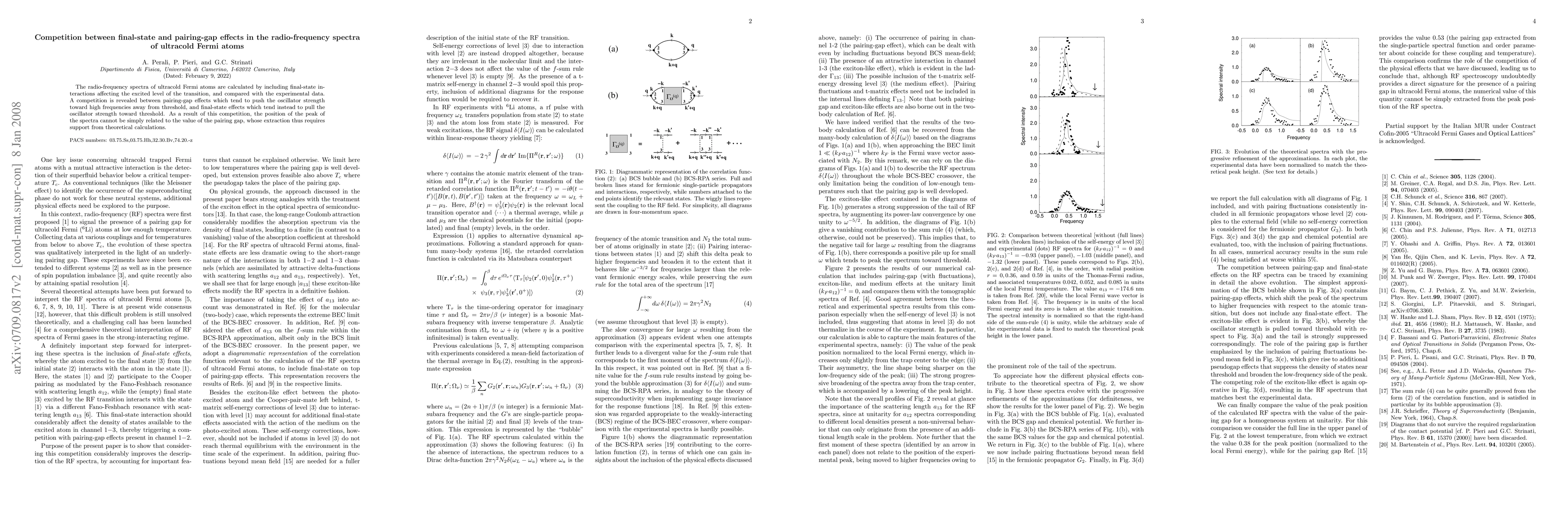 This paper investigates the radio-frequency spectra of ultracold Fermi atoms, revealing a competition between pairing-gap effects and final-state interactions. The study shows that these competing factors complicate the direct relationship between the peak position in the spectra and the pairing gap, necessitating theoretical support for accurate extraction.
