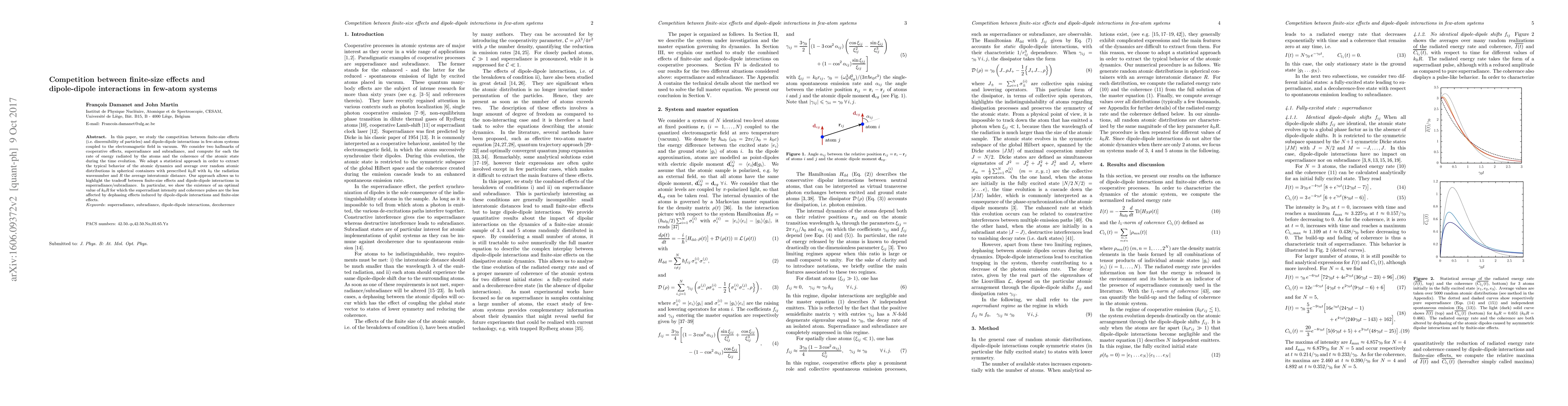 The paper presents a statistical method to analyze the competition between finite-size effects and dipole-dipole interactions in few-atom systems, identifying an optimal k₀R for minimizing dephasing effects on superradiant intensity and coherence.
